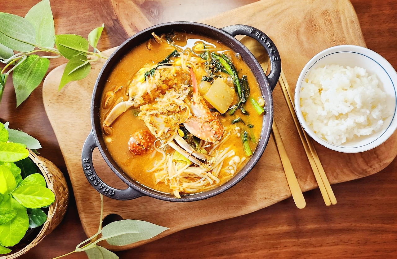 싱싱한 꽃게를 마트에서 구입했다. 꽃게탕의 양념은 된장을 베이스로 했고, 심심하게 했다. 버섯과 야채들을 많이 넣어 꽃게와 야채를 많이 먹었다.