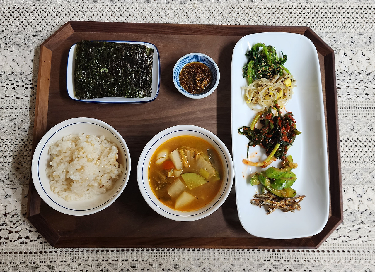 야채육수를 내어 맑게 끓인 시금치배추된장국과 집에서 만든 조미김