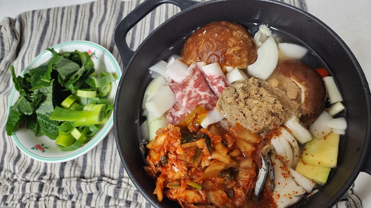 목아픔이 나아지니 된장국도 조금은 입맛 도는 찐한 된장국이 먹고 싶었다. - 차돌박이 묵은지 된장찌개