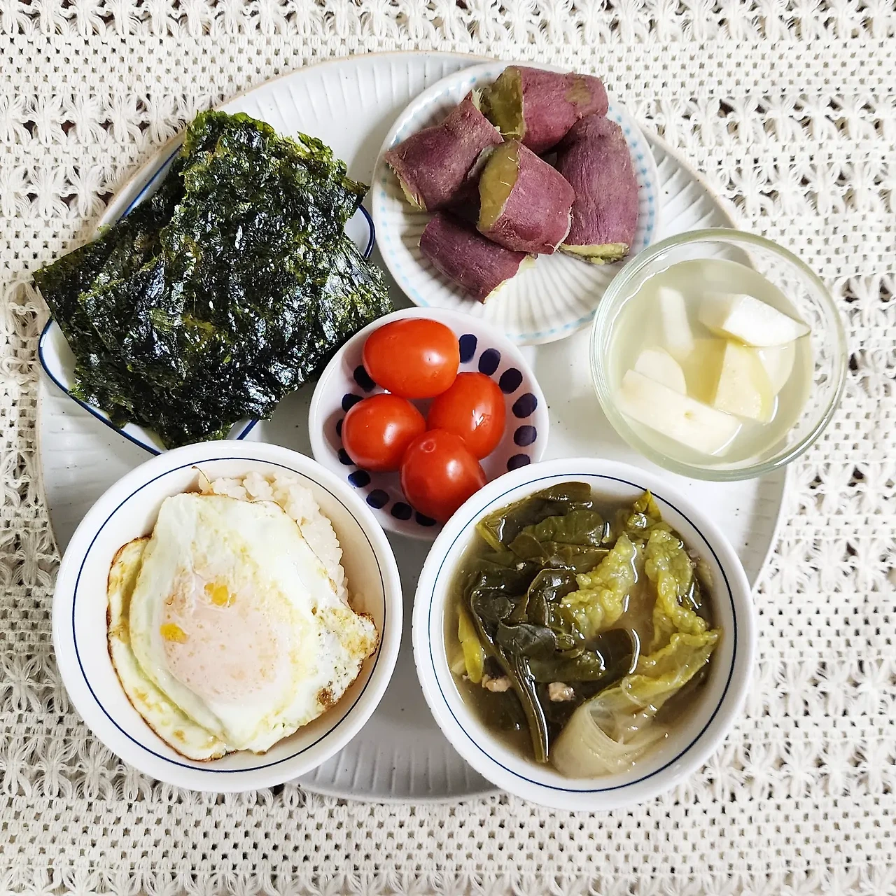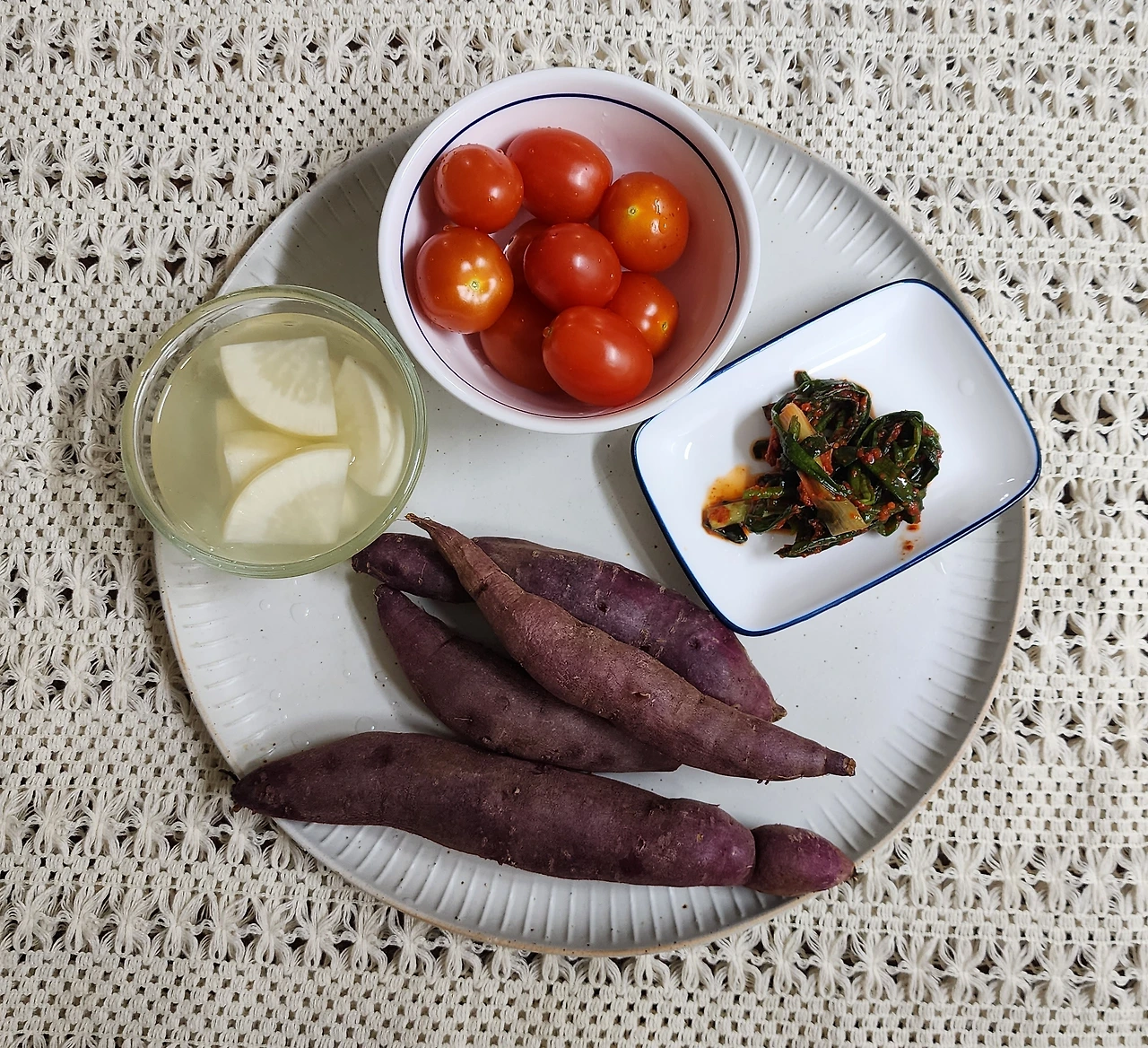 저녁으로 먹은 찐 고구마와 동치미, 방울토마토