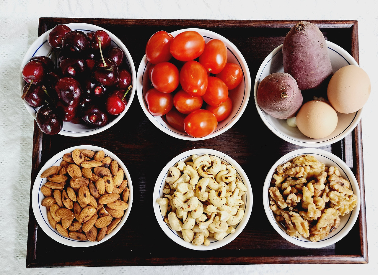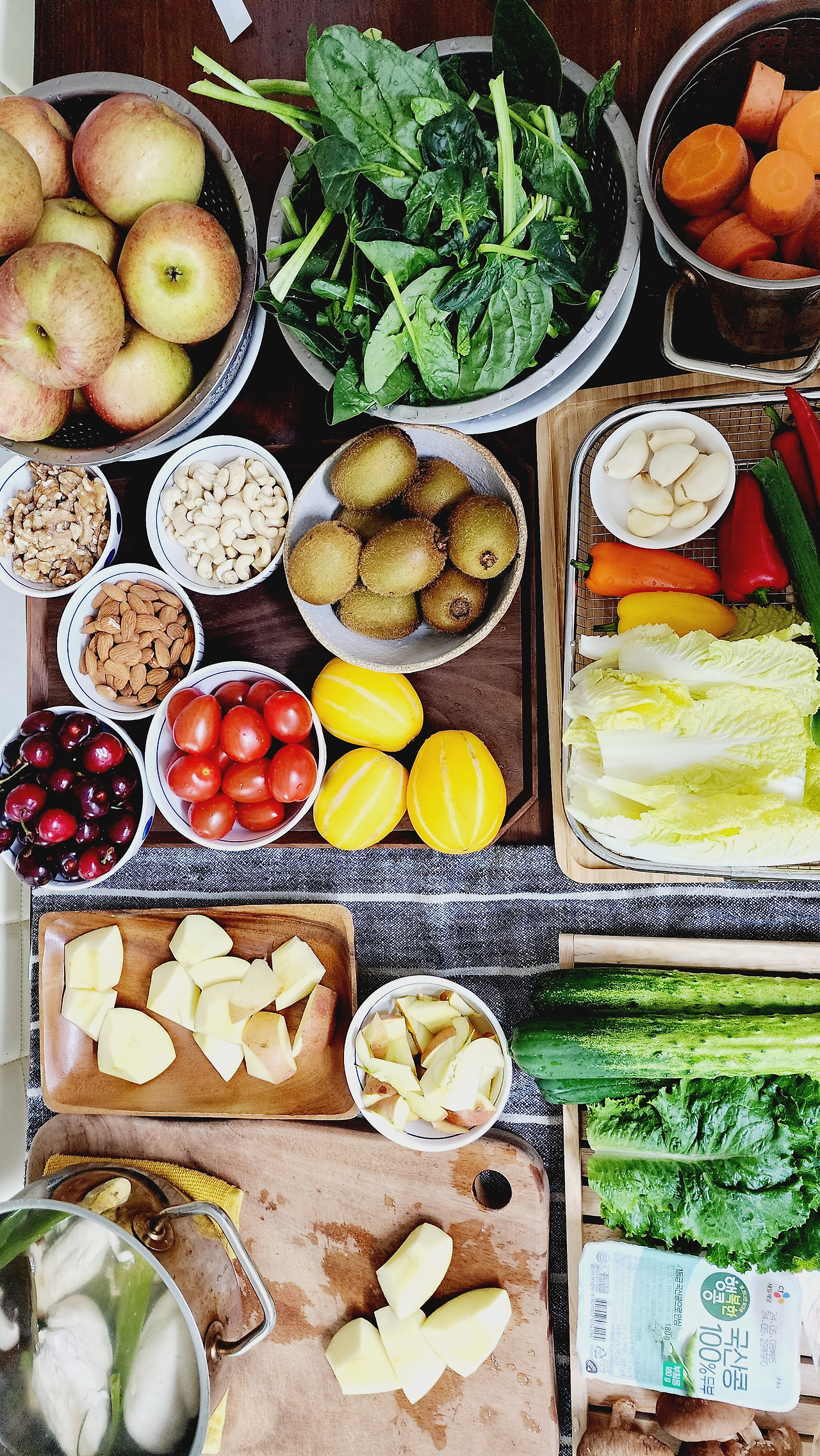 색도 생각한다. 초록색나물 1가지, 하얀색나물 1가지, 그 외 다른 색 1가지 다양한 색을 골고루 먹는 게 좋다고 한다. 그래서 나의 밥상에는 색이 다양하다. 알록달록하고 예쁜 색이다. 마지막 밥상을 점검할 때도 색을 살핀다. 검은색이 없다면, 낫또를 검정콩낫또로 먹거나 김을 함께 놓는다. 검은색이 많다면 낫또는 노란색이 된다. 과일도 다양한 색으로 산다. 노란색 오렌지나 참외, 빨간색 토마토나 딸기, 보라색의 블루베리, 초록색의 키위
