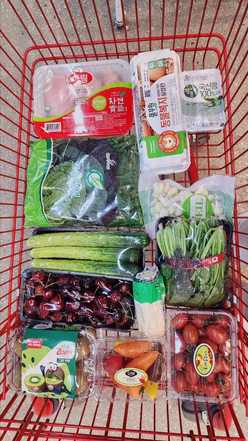 키위는 혈당관리를 위해 그린키위로만 산다. 쌈채소는 샐러드로도 쌈으로도 겉절이로도 먹을 수 있어 거의 매일 산다. 오이도 간식이 생각날 때 먹기 좋고 여름엔 반찬으로도 좋다. 시금치는 일주일에 한 번씩은 꼭 먹는다. 시금치는 찌지 않고 꼭 데친 요리를 한다. 다이어트한다는 막둥이를 위한 간식으로 체리와 파프리카를 샀다.