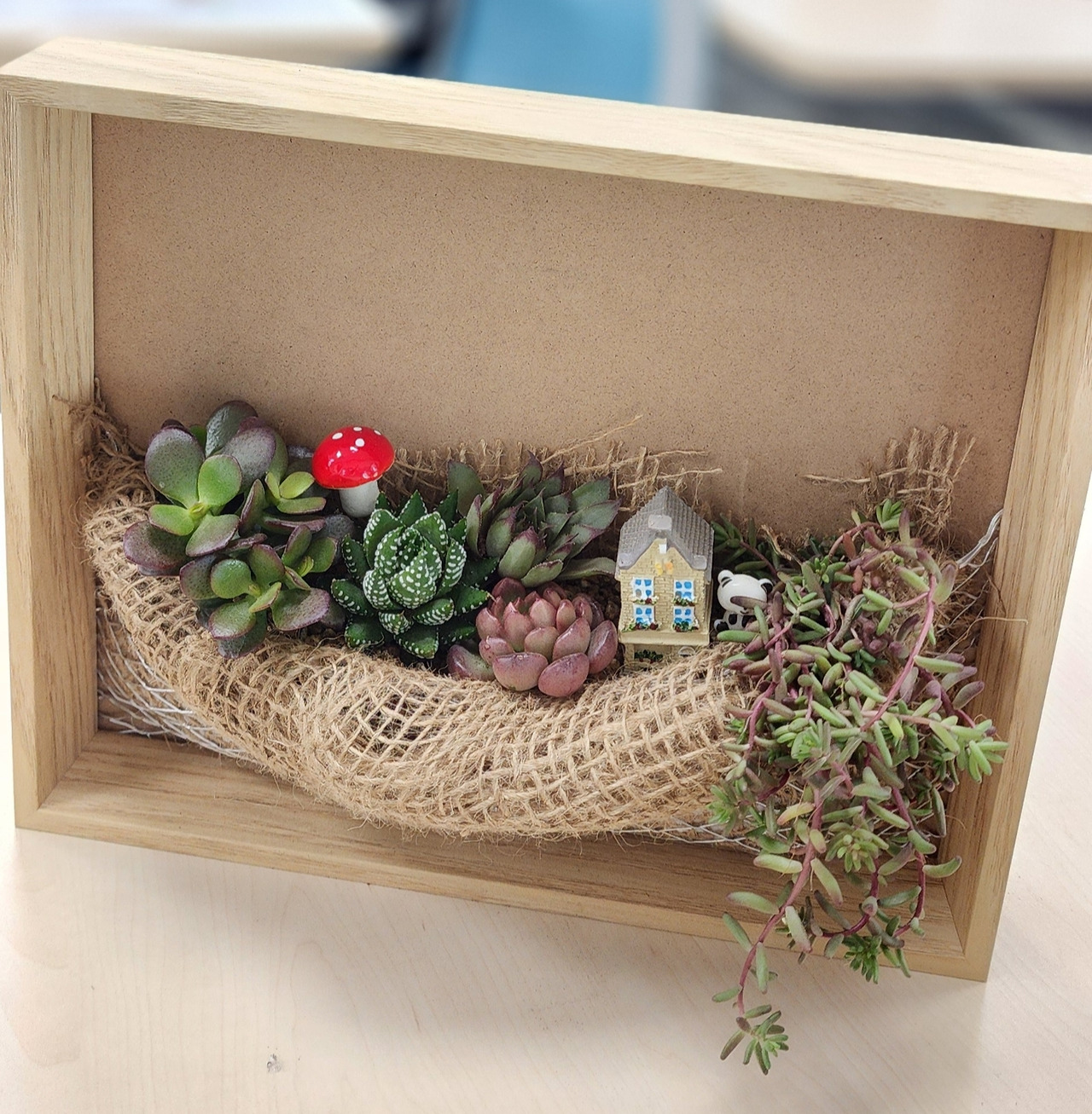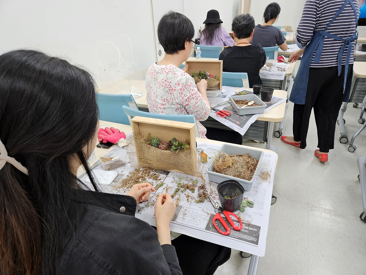 이렇게 모든 준비가 된 수업에 우리는 즐겁게 만들기만 하면 된다. 그리고 완성된 작품들은 모두 우리를 위한 선물 같다. 다육이액자 만들기의 가장 힘든 부분은 철망을 액자에 고정하는 작업인듯하다. 나만 힘든 건가 했는데 모든 분들이 힘들어하신다. 처음이라 요령을 몰라서 힘들었던 것 같기도 하다.