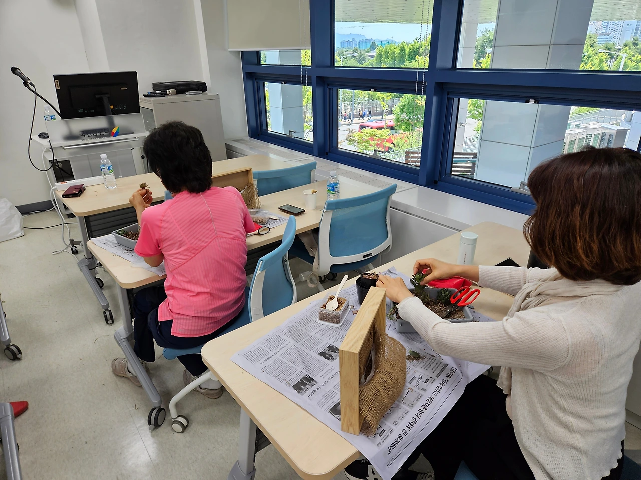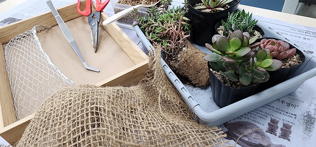 국립암센터 신관 2층도 이제 익숙한 공간이 되었다. 오늘의 수업은 다육이 액자 만들기다. 액자가 꽤 크다. 강사님이 준비 중인 테이블에 다육이들이 벌써 자리를 잡았다. 오늘도 많은 준비를 하셨다. 감사하다.