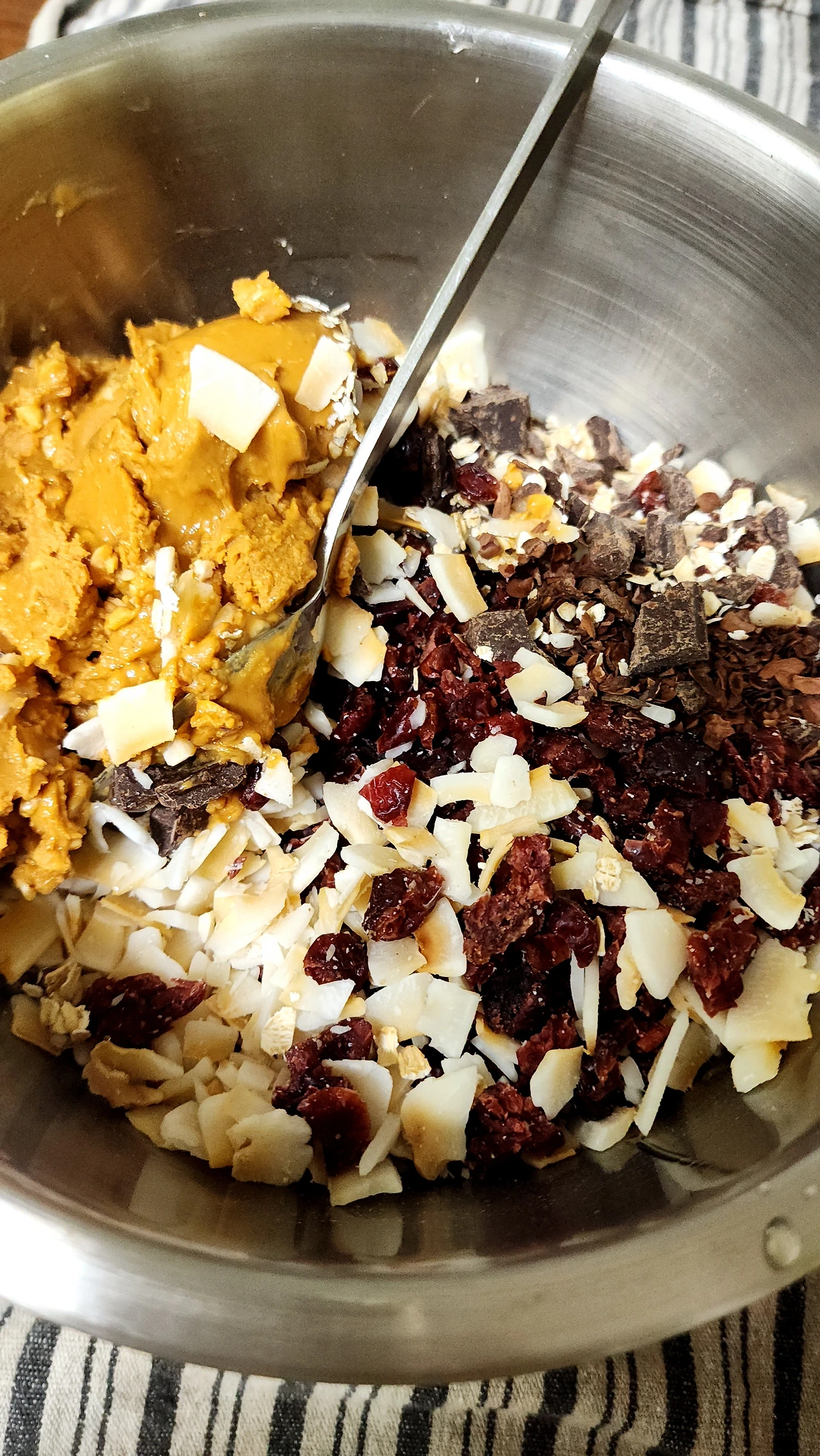 1. 말린 라즈베리를 썰어주고, 100% 땅콩버터, 오트밀, 100% 카카오 초콜릿과 카카오칩, 코코넛칩, 두유, 꿀을 넣고 반죽을 만든다.