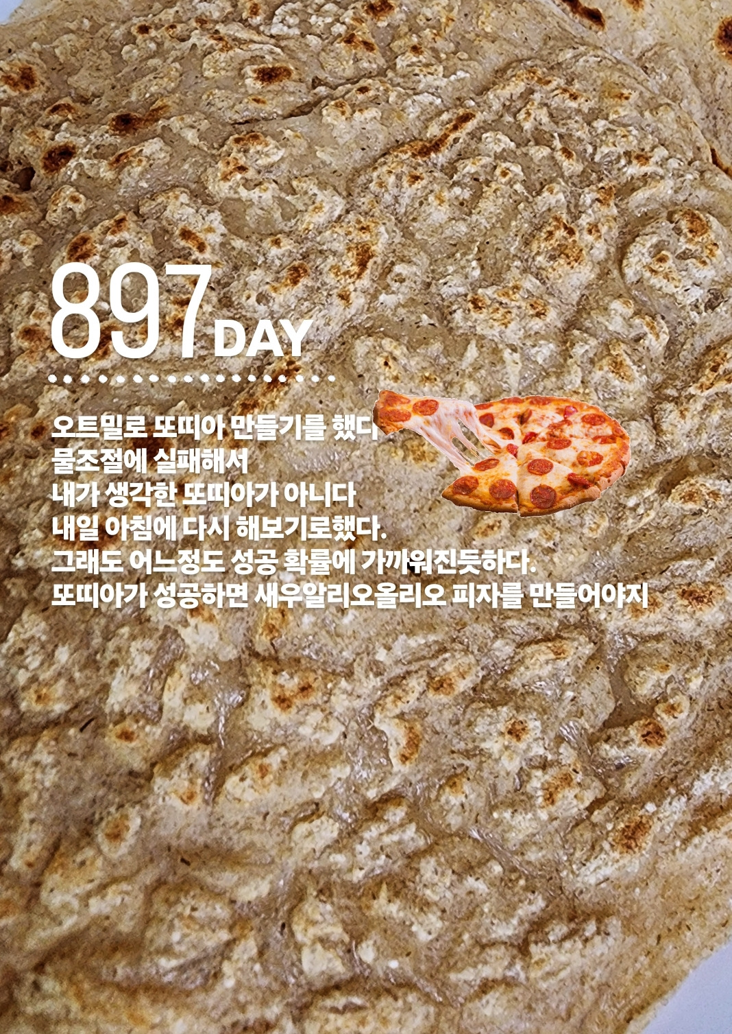 재미있는 모양새를 하고 있다. 모두 한가족이라듯 한 덩어리가 된 반죽을 보고 이건 아니구나 싶었지만 한 장을 테스트로 구워보았다. 역시 실패였다. 다시 물을 조금 더 부었다. 두 번째 반죽 상태로 다시 구워보았다. 처음보다는 나아졌지만 역시 내가 영상으로 배운 모양새는 아니다. 다시 물을 좀 더 부었다 대략 오트밀과 물의 비율이 1:2 정도의 농도일듯하다. 세 번째 테스트를 했다. 어느 정도 생각한 부풀림도 조금 있고, 두께도 좋은듯하다. 하지만 이것도 실패다.