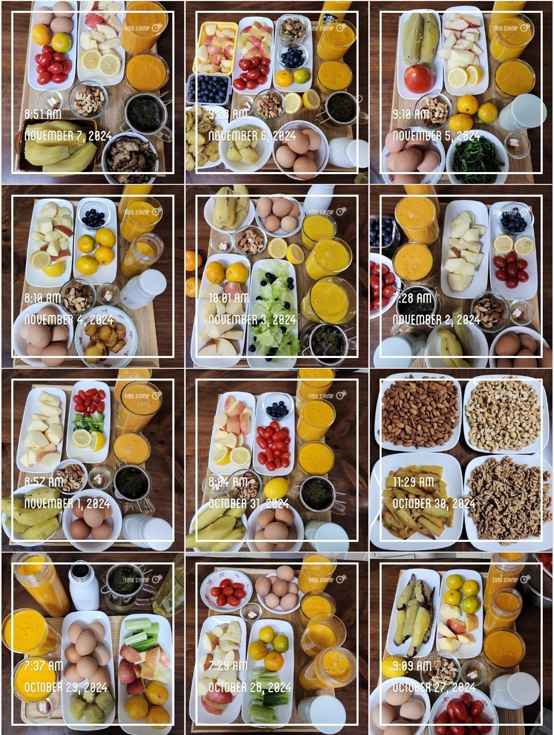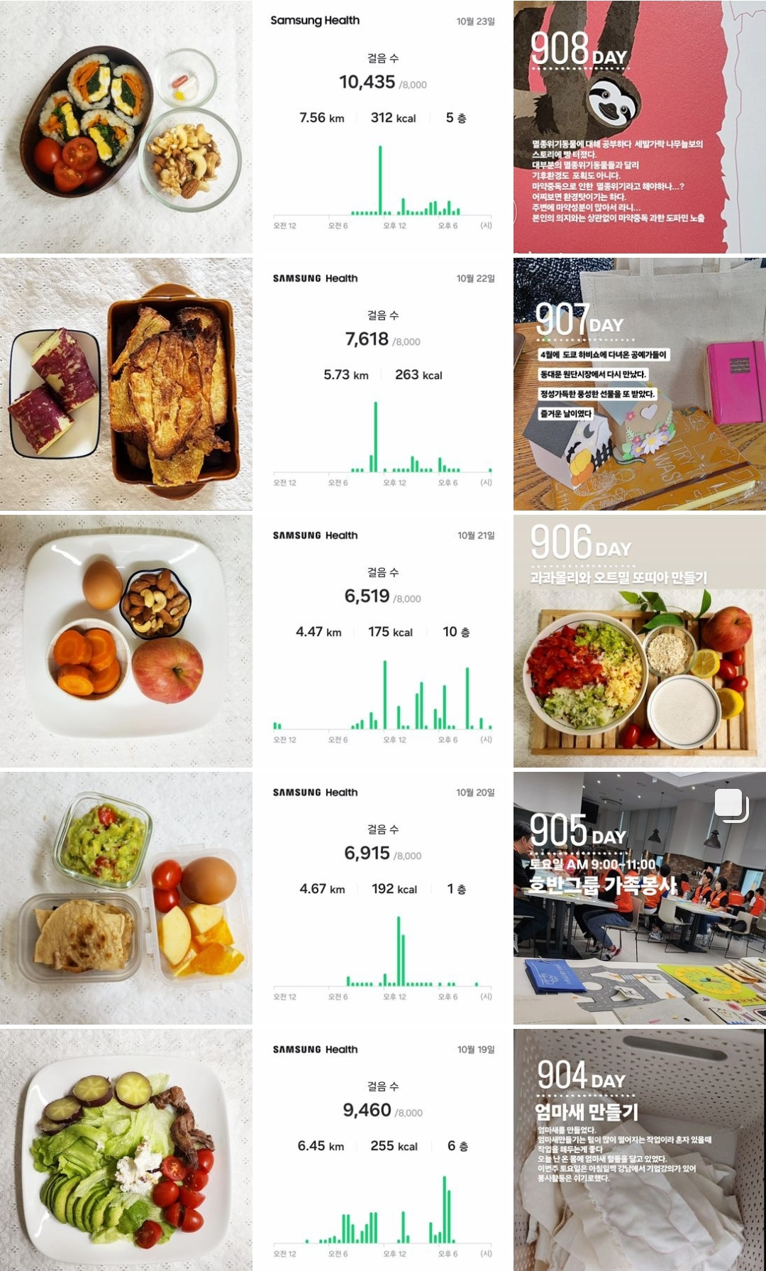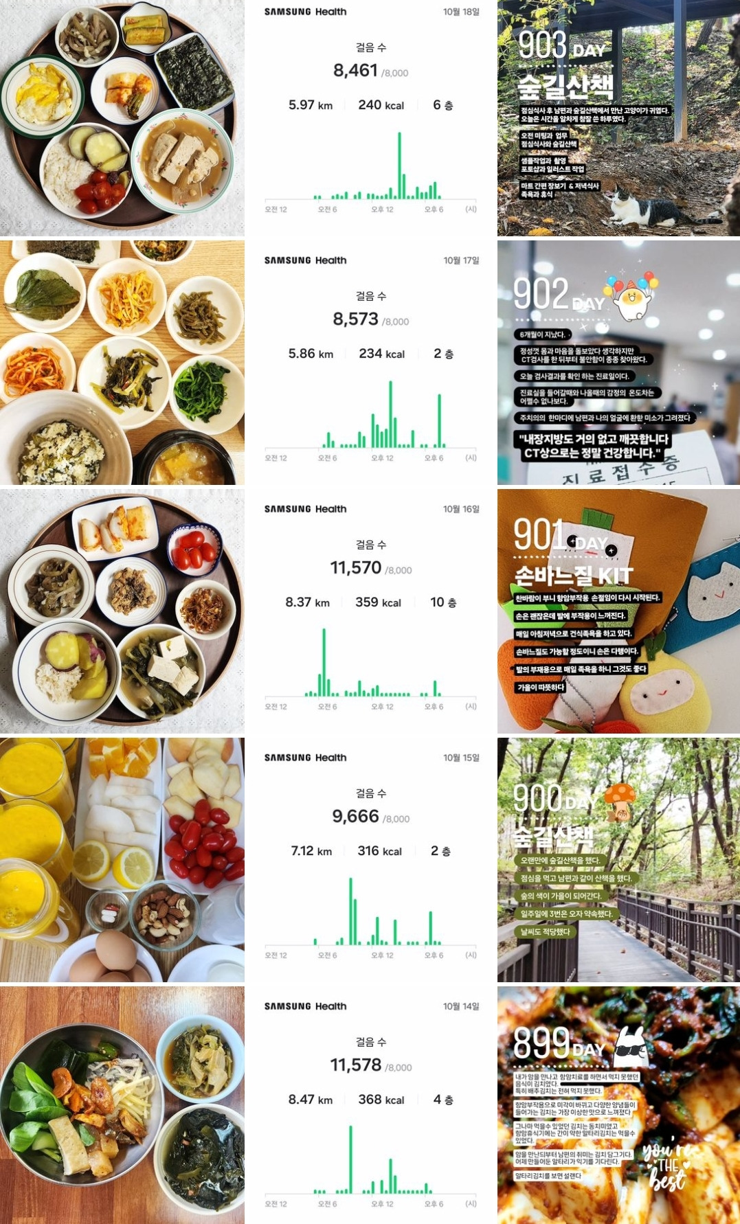 아침에 먹는 당근사과주스와 찐계란, 견과류, 과일, 녹차등을 기록하고 있다. 아침에 먹는 음식들은 항암에 좋은 음식과 면역력에 좋은 음식들이다. 하루에 한 끼 이상은 집밥을 먹으려고 노력하고 있다. 사진으로 기록하는 음식은 대부분은 내가 만든 밥상으로 기록하고 있다. 외식을 하거나 꼭 기록하고 싶은 내가 그날 먹은 음식들을 기록한다.