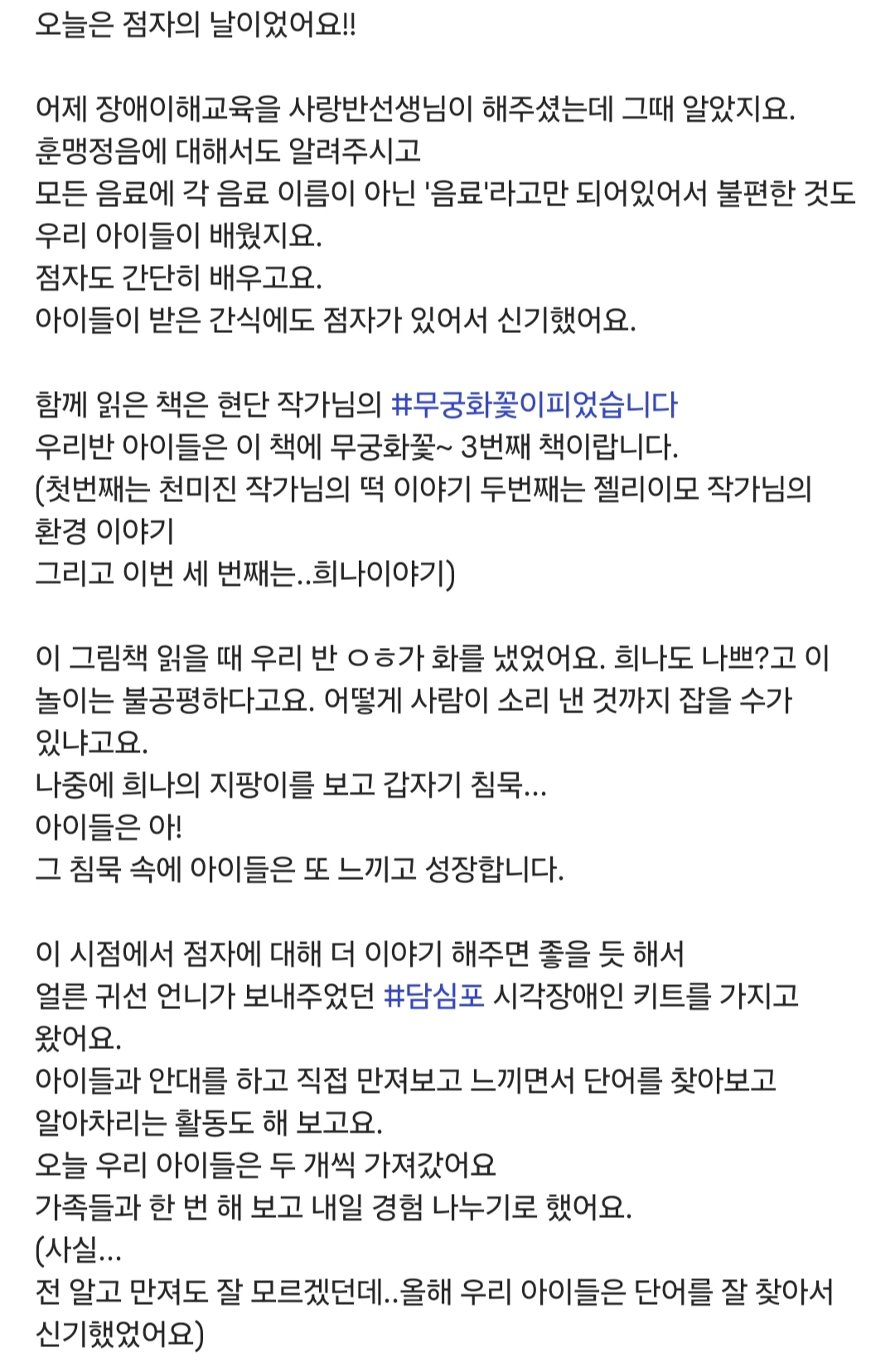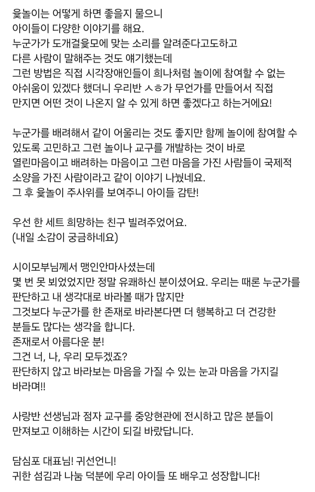 담심포의 점자촉각교구재가 아이들에게 시각장애 아동을 이해하고 함께 살아가는 방법을 배우는 시간에 도움이 되었다니 참 기쁘고 뿌듯했습니다.