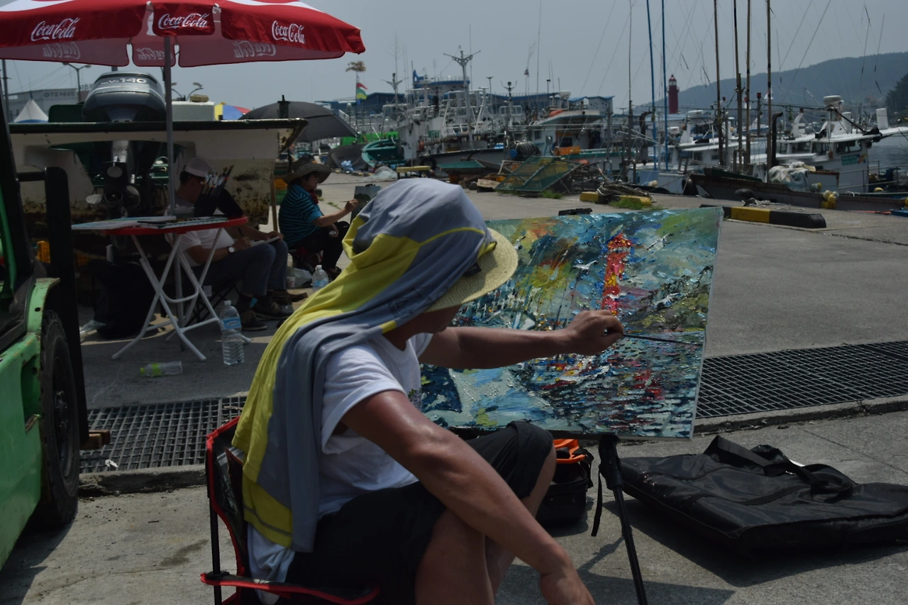뜨거운 뙤약볕 아래 몇몇 화가들이 대변항의 모습을 화폭에 옮기고 있었다. "그림 그리는 모습을 찍어도 될까요?" 정중하게 양해를 구하고 한 컷의 사진을 찍었다. 사진으로는 너무나 쉽게 찍어낼 수 있는 장면을 화가들은 붓끝으로 일일이 터치를 해가며 마음속의 심상을 그려내고 있다. 보는 대로 그리는 것이 아니라 마음의 감흥을 표현하고 있다.