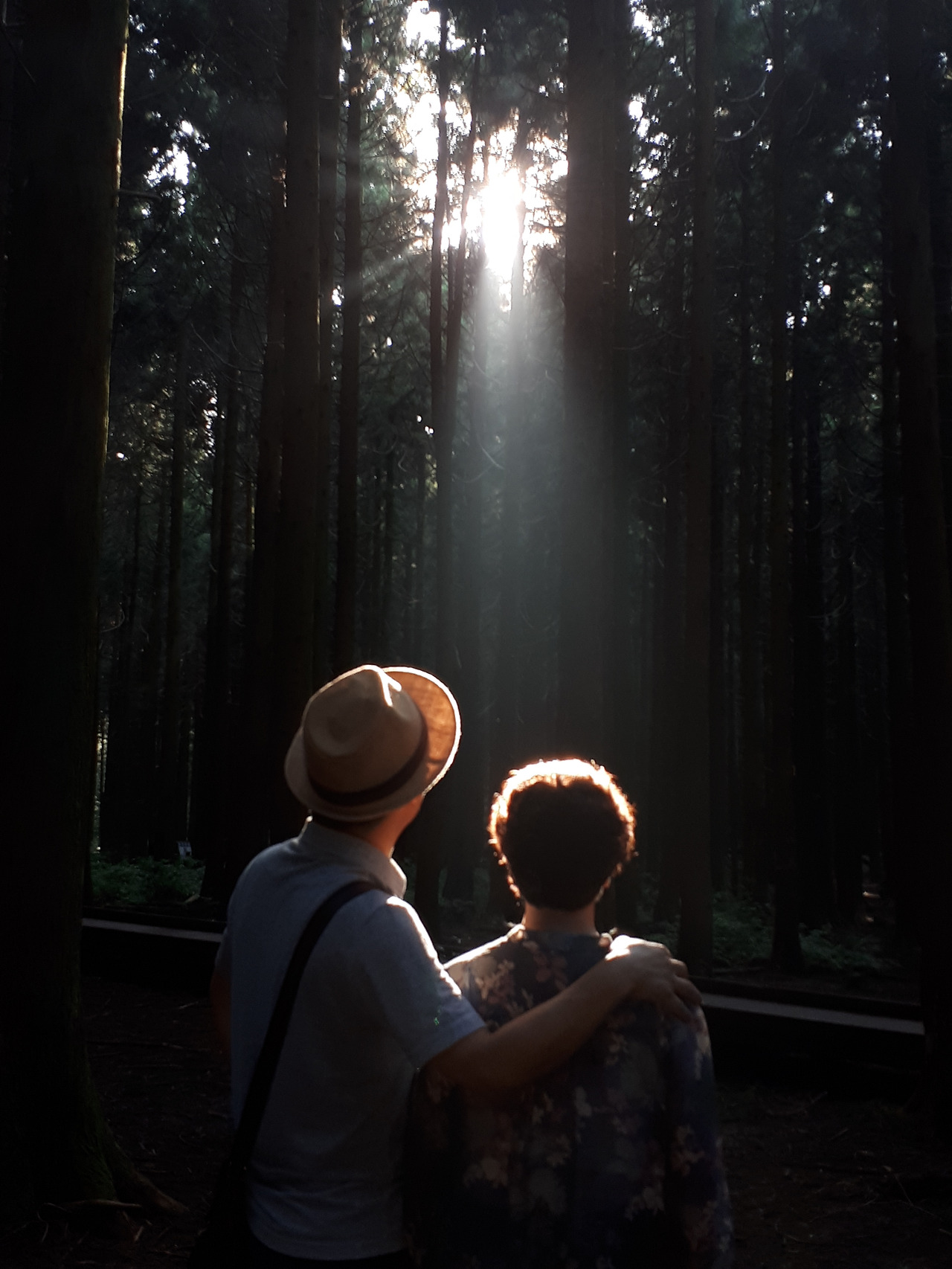 우뚝 선 삼나무 숲 사이로 비친 빛은 신령한 분위기를 자아낸다.