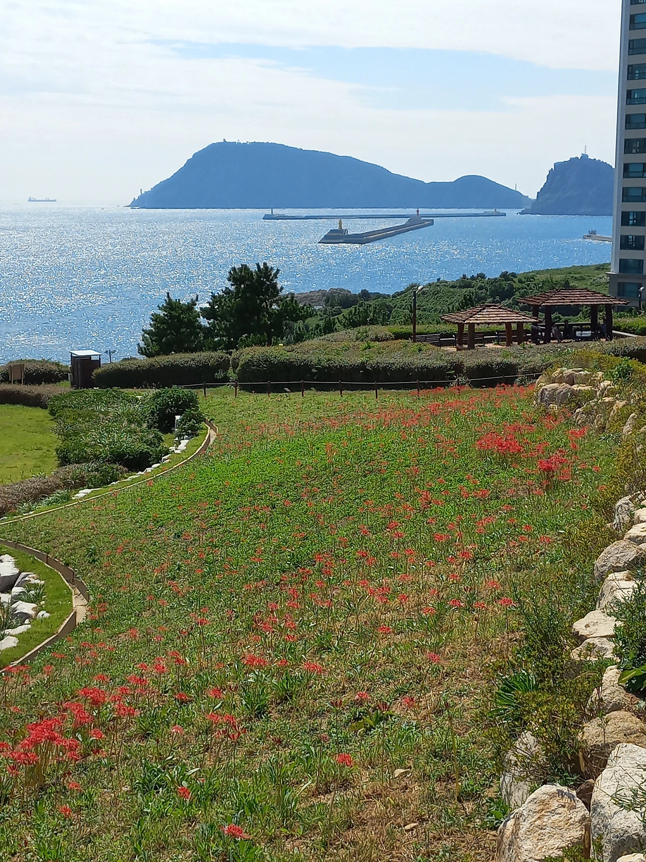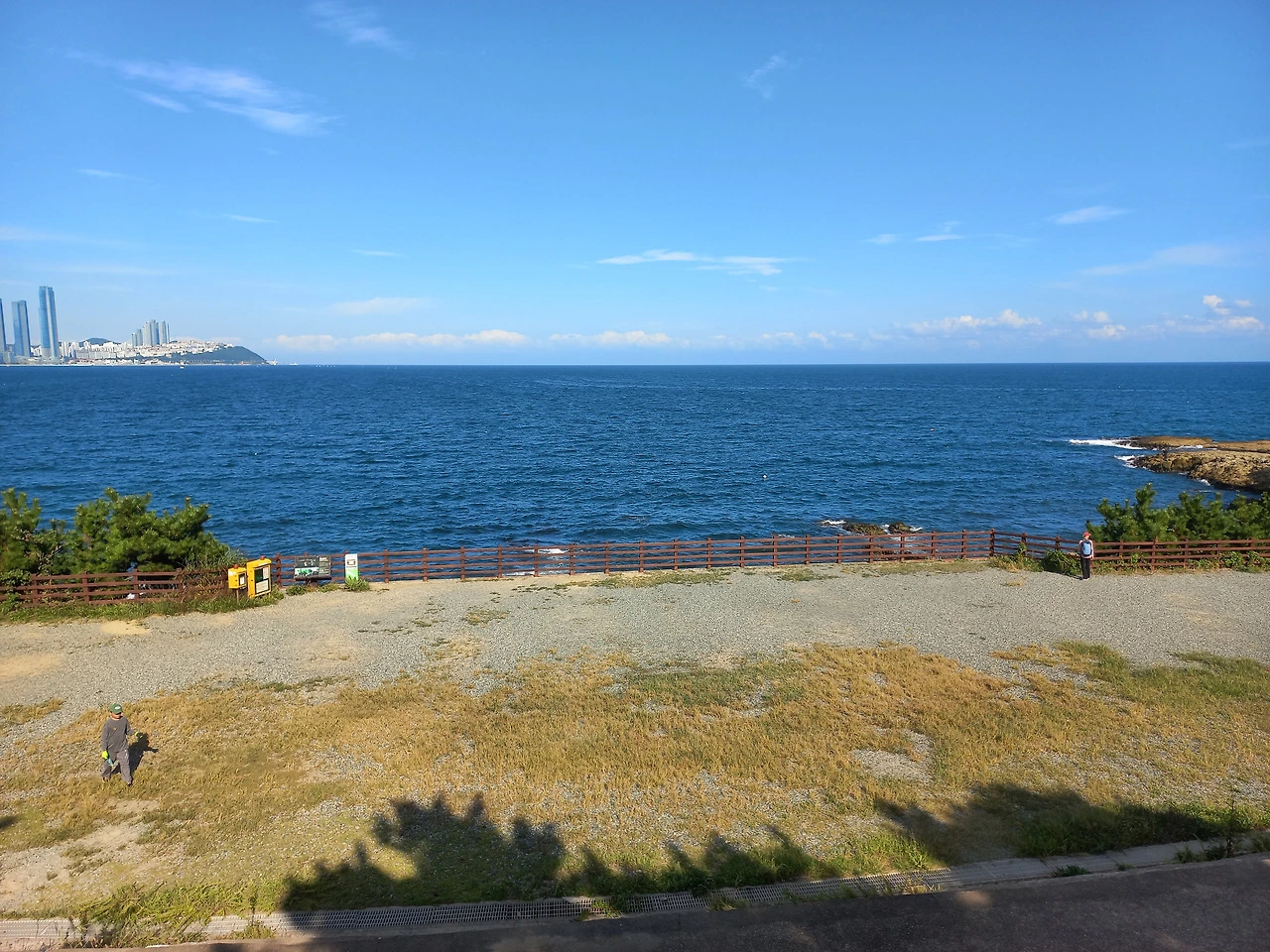 이기대 어울마당이다. 널찍한 마당과 바다가 훤히 보이는 계단에 앉아 바닷바람을 한껏 안으며 달콤한 쉼을 만끽하고 있다. 저 멀리 해운대가 보인다. 광안대교와 그 뒤로 장산, 그 오른쪽에 마린시티의 거대한 고층 건물, 그리고 하늘로 쭉 뻗은 세 개의 LCT 건물. 오른쪽에 달맞이 고개와 그 아래로 블루레일웨이. 달맞이 고개 끝에는 청사의 꿈을 꾸는 스카이워크와 하얀 등대 그리고 빨간 등대. 그 옆으로는 파란 수평선. 수평선 위로는 파스텔톤 하늘과 구름.