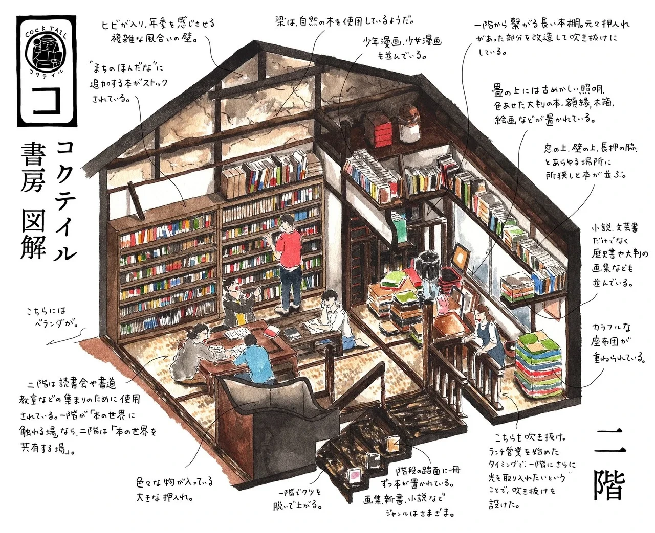 1997년에서 코엔지가 아닌 쿠니타치시에서 처음 서점으로 첫 오픈을 한 이곳은 책을 사랑하는 젊은 대학생들이 책을 읽으며 술을 마시는 장소로 점점 변화하면서 그 당시 굉장히 희귀하지만 책방과 바를 결합시킨 형태로 지금 발전하였다고 한다.