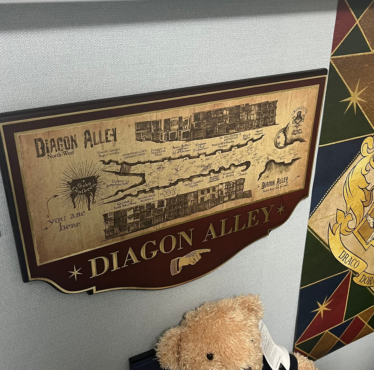 만년달력 다음으로 구매한 것은 <다이애건 앨리 굿즈>이다. 다이애건 앨리 지도가 정교하게 그려져 있어, 벽에 걸어두면 한층 더 마법스러운 분위기를 연출할 수 있다. 특히 지도 속 손가락이 오른쪽을 가리키고 있어, 마치 그 너머에 진짜 다이애건 앨리가 존재할 것 같은 느낌이 든다. (이렇게 상상을 자극하는 굿즈들을 좋아하는 편이다)