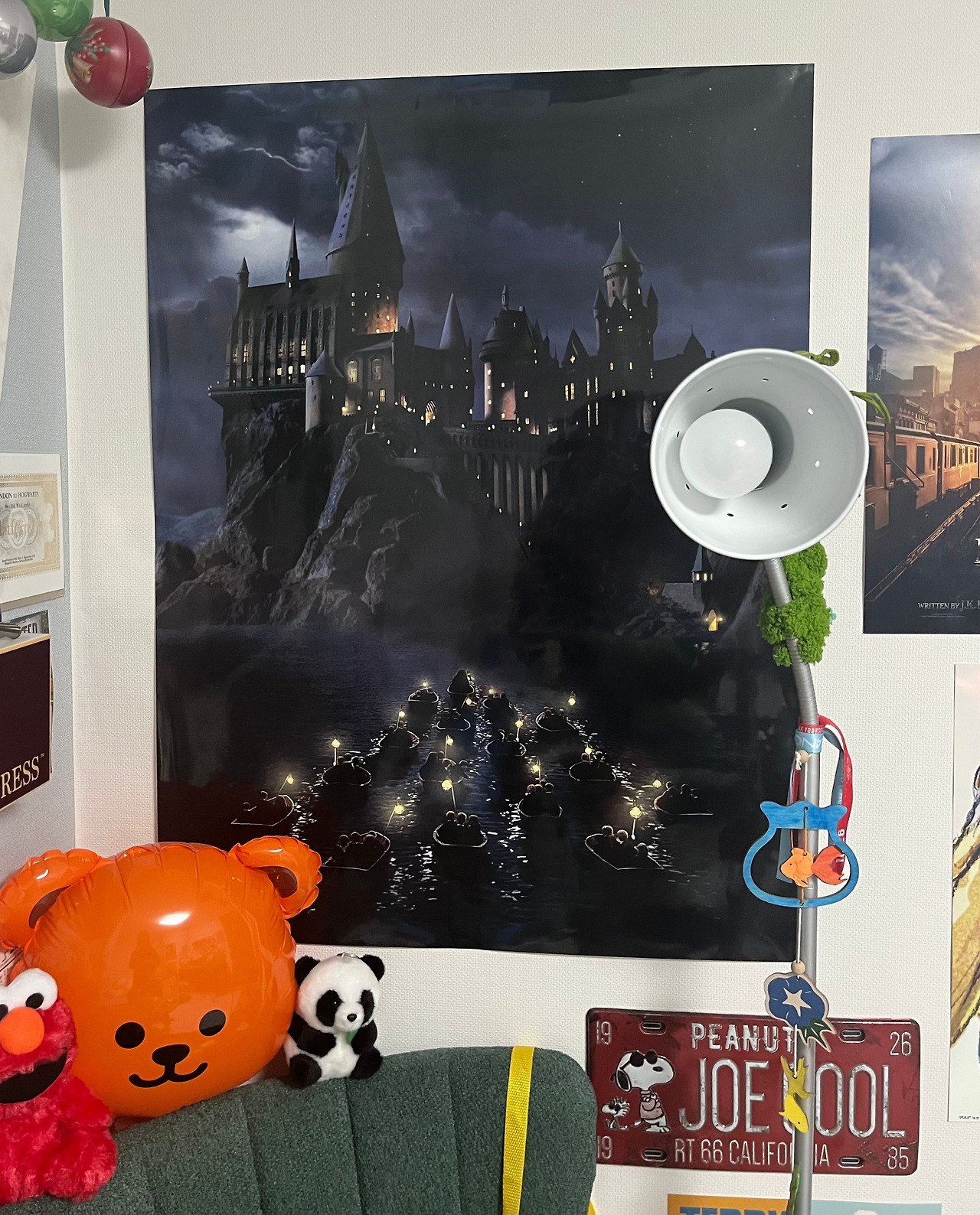 그렇게 방 꾸미기를 시작하면서 가장 처음 산 해리포터 굿즈가 바로 <호그와트 성 포스터>였다. 빈 방에서 가장 강렬한 시각적 효과를 줄 수 있는 아이템을 고민하다 보니, 자연스럽게 포스터를 선택하게 되었다. 이 장면은 해리포터에서 내가 가장 좋아하는 장면이라, 볼 때마다 묘한 설렘을 느낀다. 실제로 멀리서 보면 포스터 속 등불이 은은하게 빛나는 것처럼 보여, 그냥 바라만 보고 있어도 기분이 좋아진다. (마치 해리포터 영화를 보다가 저 장면에서 잠깐 정지 버튼을 누른 느낌이랄까) 그리고 개인적인 취향을 덧붙이자면, 이 포스터를 제외하고는 해리포터 영화 포스터를 그다지 좋아하지 않는다. 해리포터 영화 포스터에는 배우 얼굴이 너무 많이 나와서, 방에 걸어두기엔 조금 부담스럽기 때문..