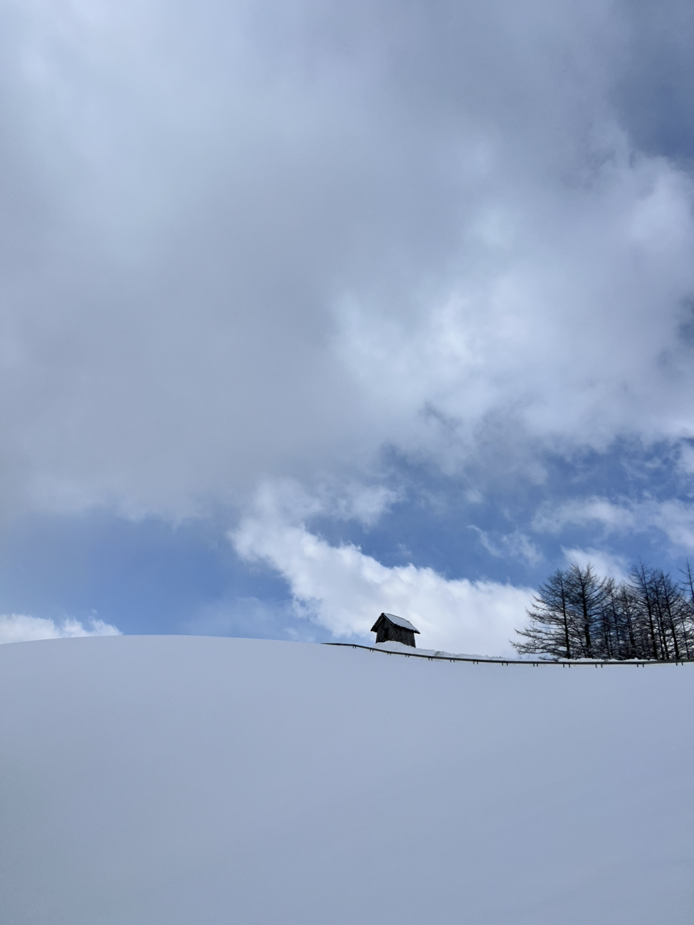하얀 숲, 눈덮인 언덕, 고요한 하늘.