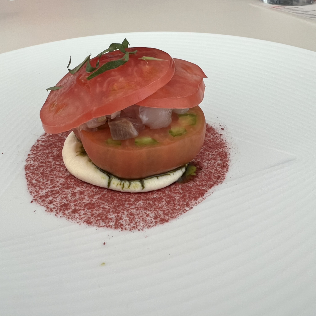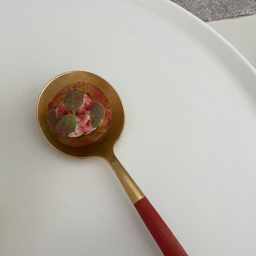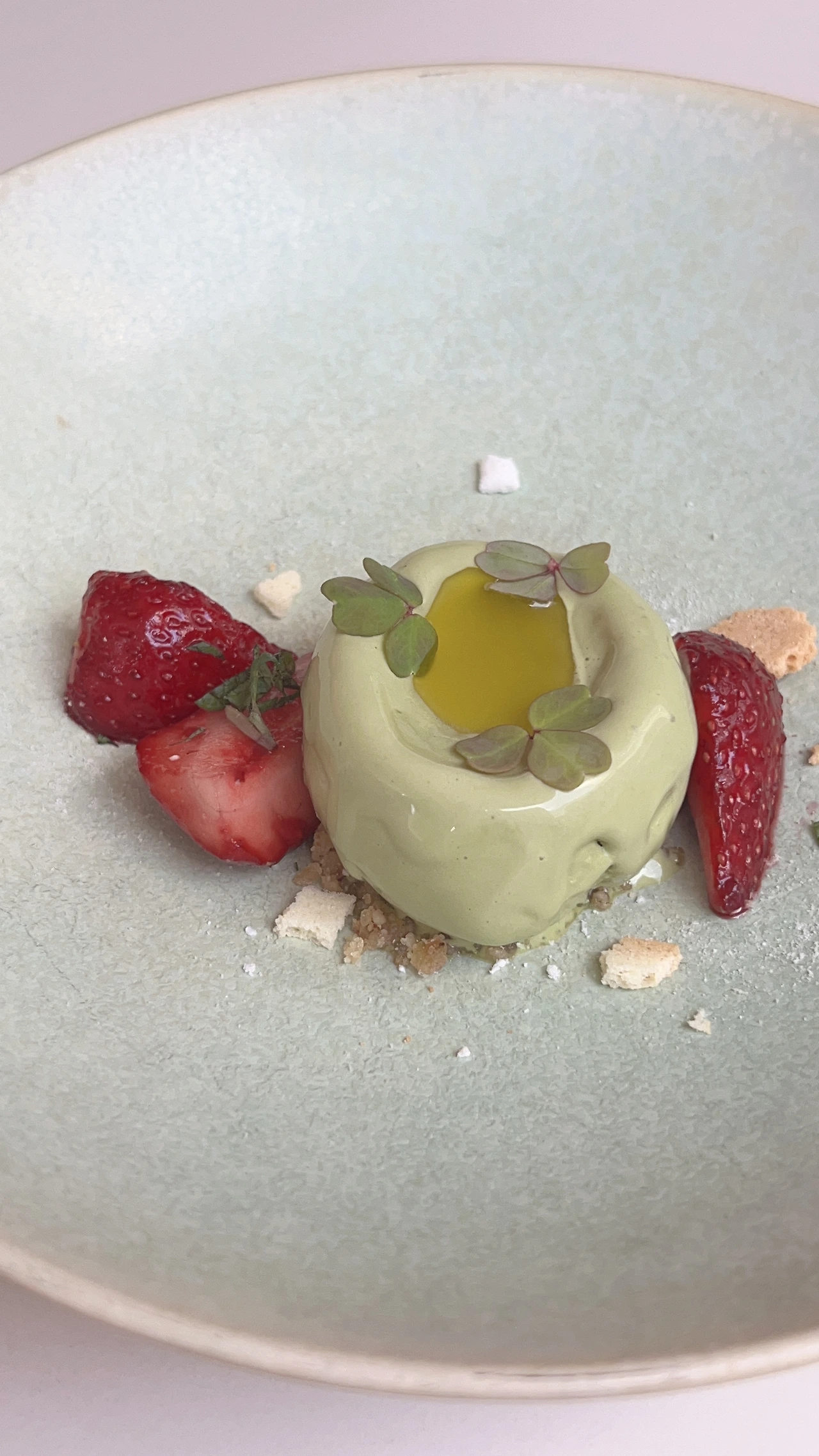 첫 접시는 부드러운 녹색 크림과 잘게 썬 딸기, 바삭한 텍스처가 함께한 전채.