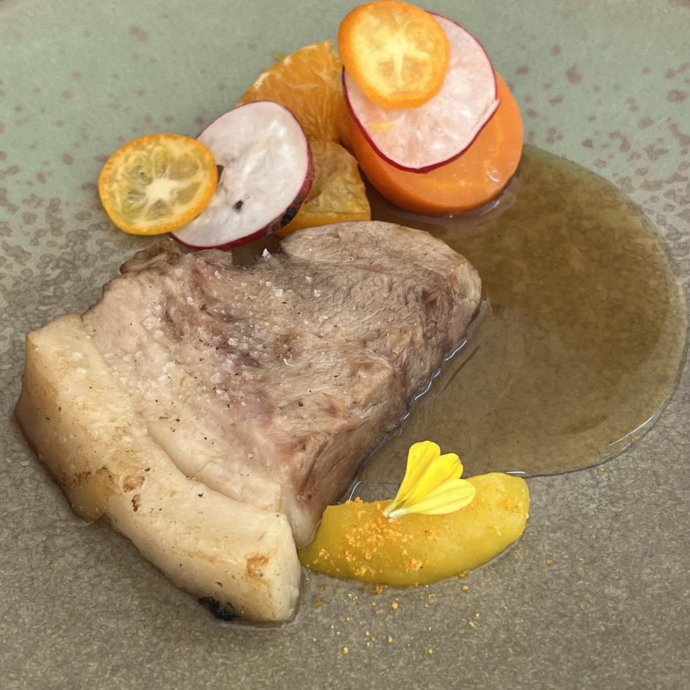 촉촉하고 담백한 고기 위로 곱게 얹힌 무와 감귤, 당근이 맛의 균형을 섬세하게 잡는다.