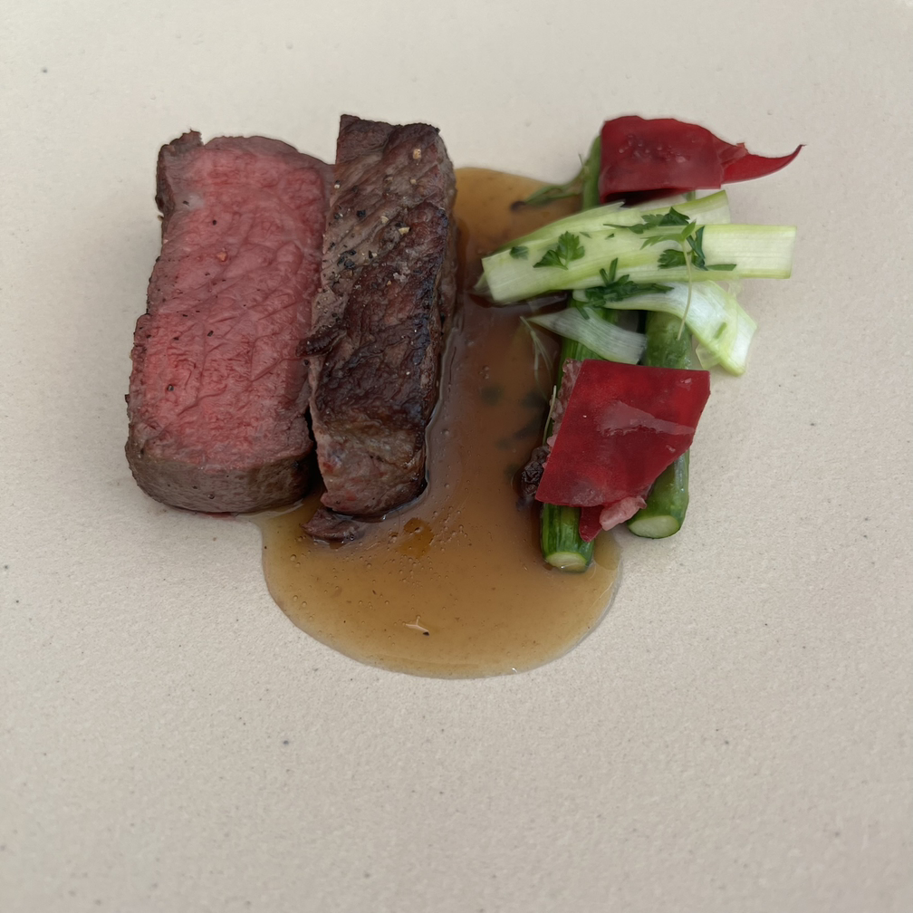 이어지는 스테이크는 미디엄 레어로 완벽하게 구워져, 붉은 속살이 조용히 존재감을 드러낸다.