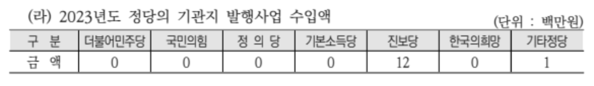 하지만 국민의 힘의 경우 기관지 발행 사업 수익이 백만원 이하이다.