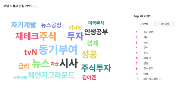 그리고 이 채널의 키워드와 영상이 마음에 들었다면, 이 채널의 시청자들이 구독하고 있는 ‘관심사’와 ‘카테고리’를 확인해 유사한 채널로 시청을 이어나갈 수도 있다. 실제 이들의 구독 데이터를 기반으로 보여주기에 원하는 것에 가까운 채널을 발견할 가능성이 높다. 예를 들면 가장 높은 접점인 ‘지식/정보’ 카테고리의 상위 채널들을 몇 개만 살펴보면 똑똑해지고 싶은 욕망을 채워줄 채널을 금방 찾아낼 수 있다.
