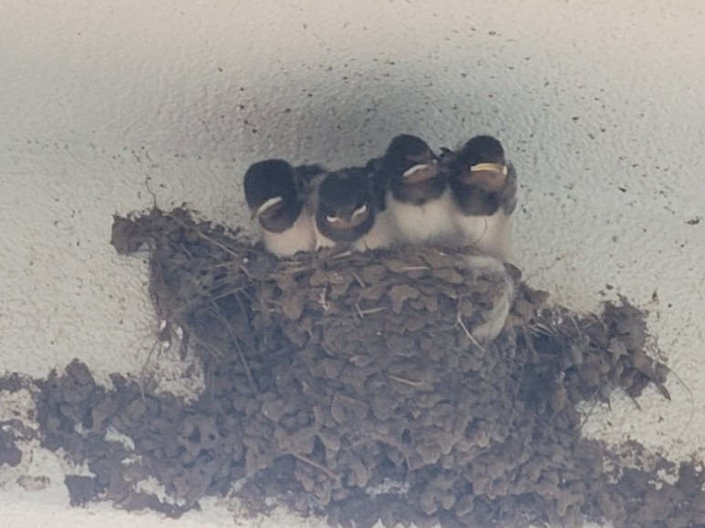 테라스 위, 어딘가들에 제비집이 여러 개 있다.