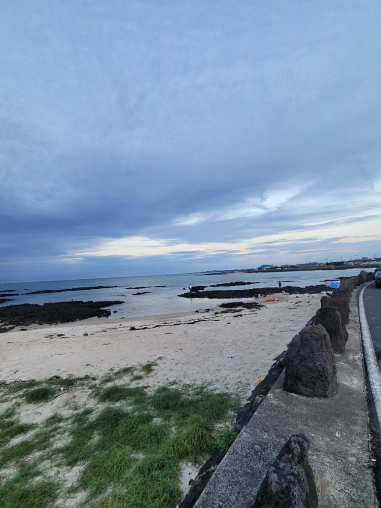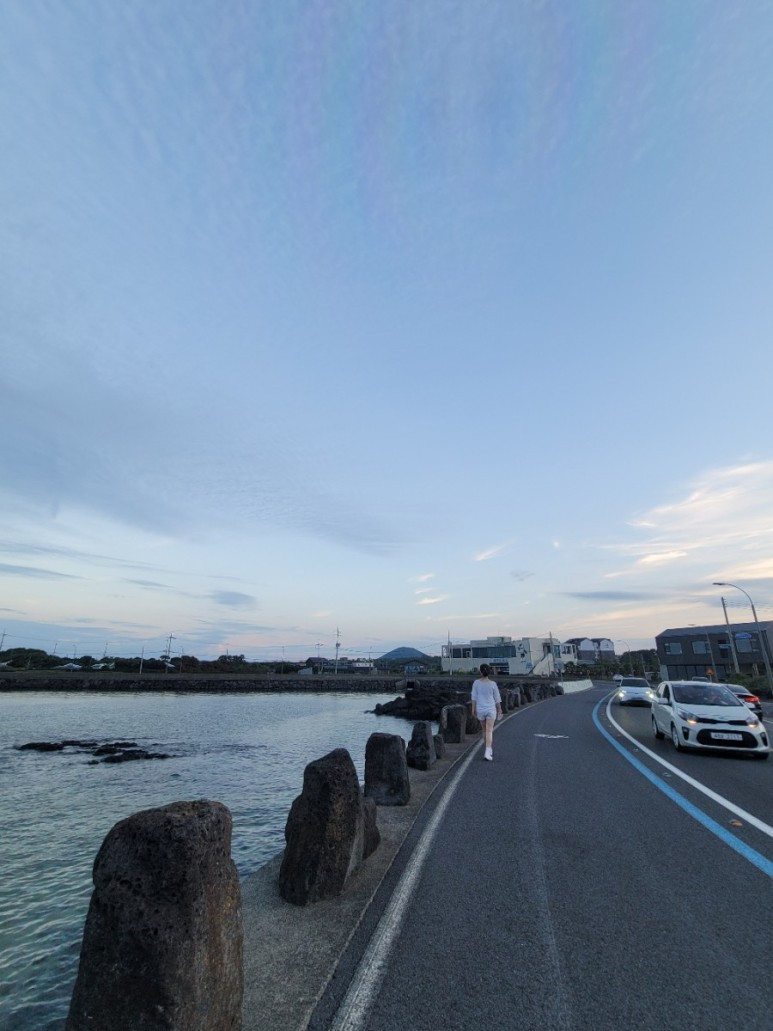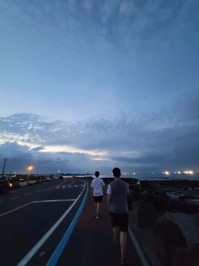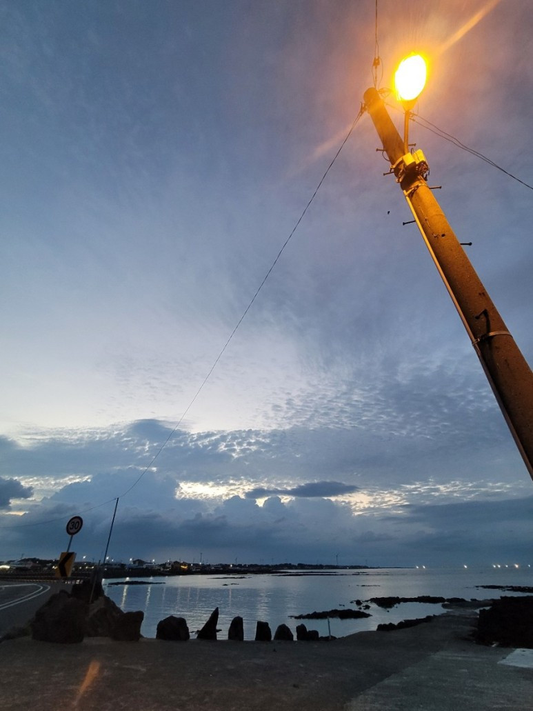 오늘은 지는 노을보다 노란 가로등 불빛이 예쁜 제주의 평범한 휴일 저녁이다.