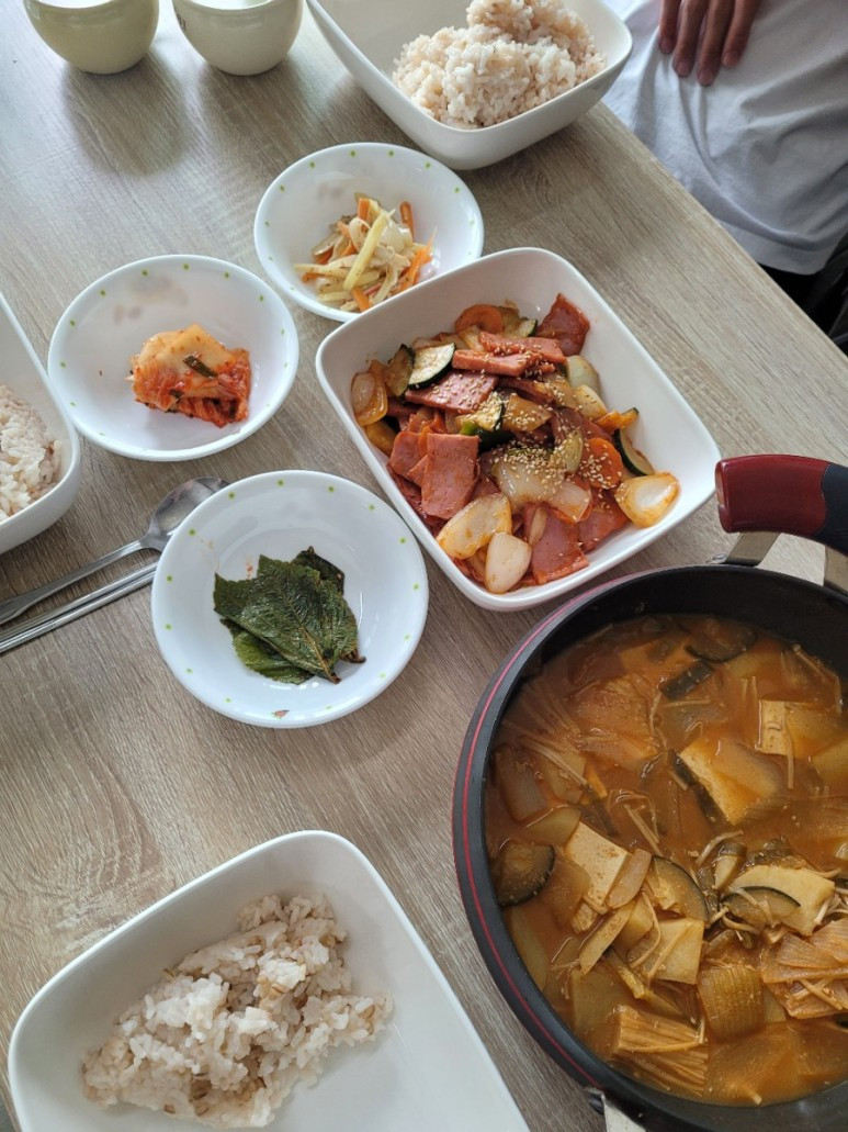 어제 남은 된장찌개에 숯불향이 난다는 햄이랑 야채를 볶아서 밥 한
