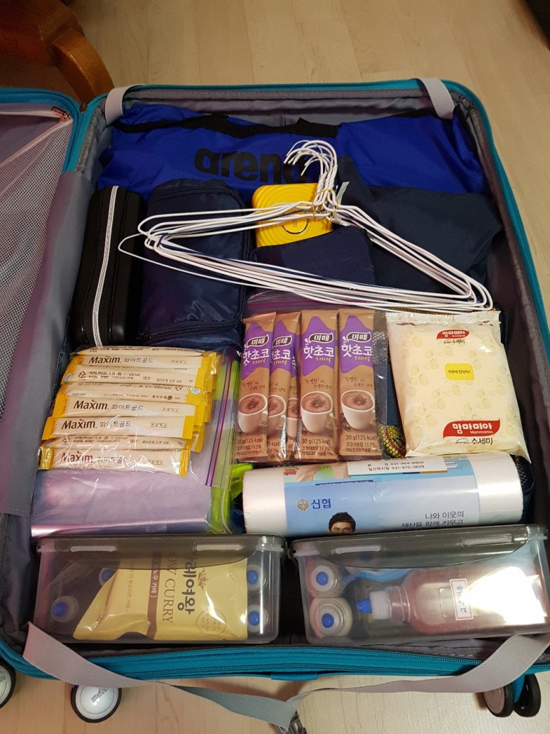 각자 입을 옷, 이불이랑 베개커버, 수건이랑 비치타월, 바람막이를 캐리어에 차곡차곡 넣었다.