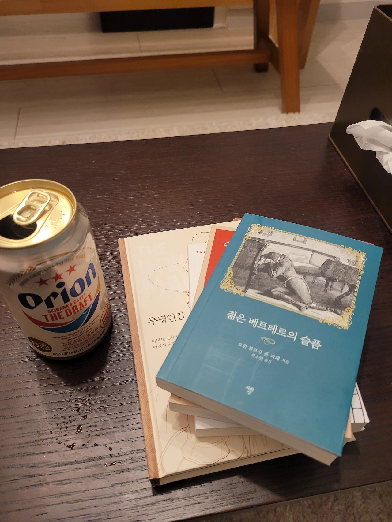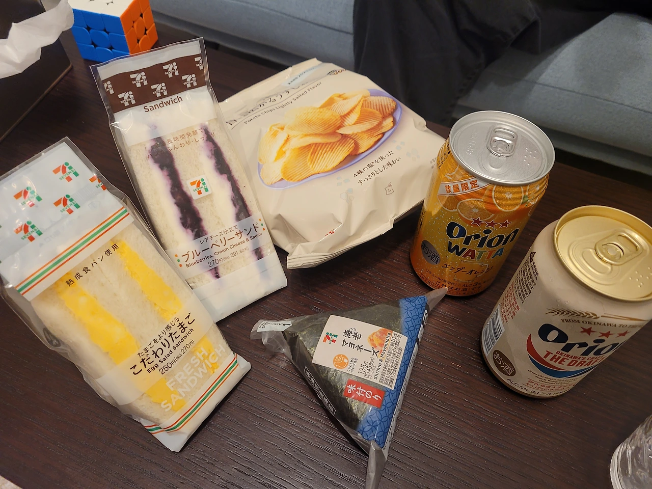 샌드위치랑 과자, 물이랑 오리온 맥주를 사 들고 들어왔다.