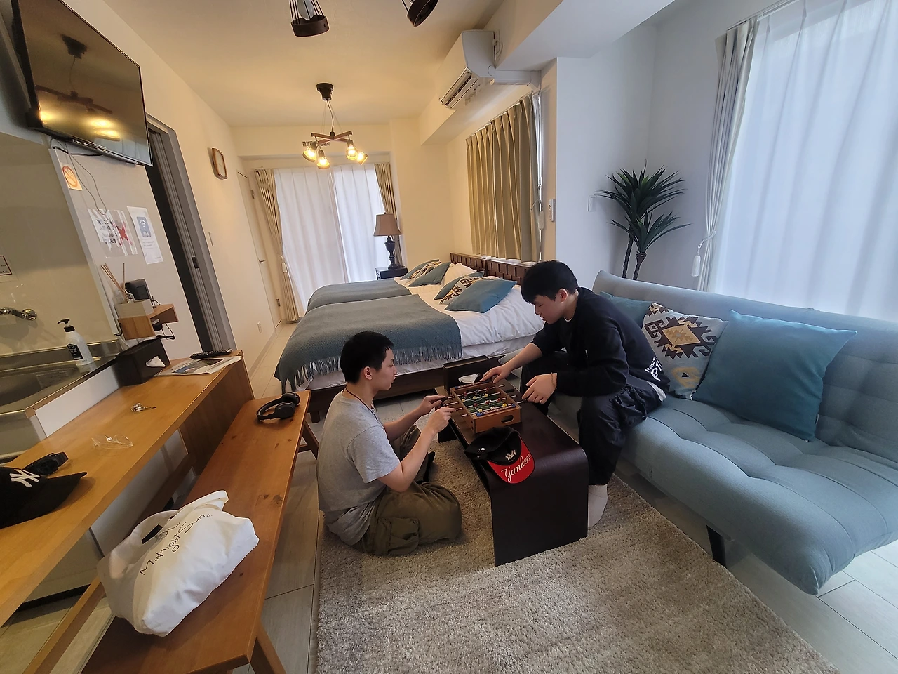 큰 침대 두 개와 소파베드가 있는 스튜디오다.