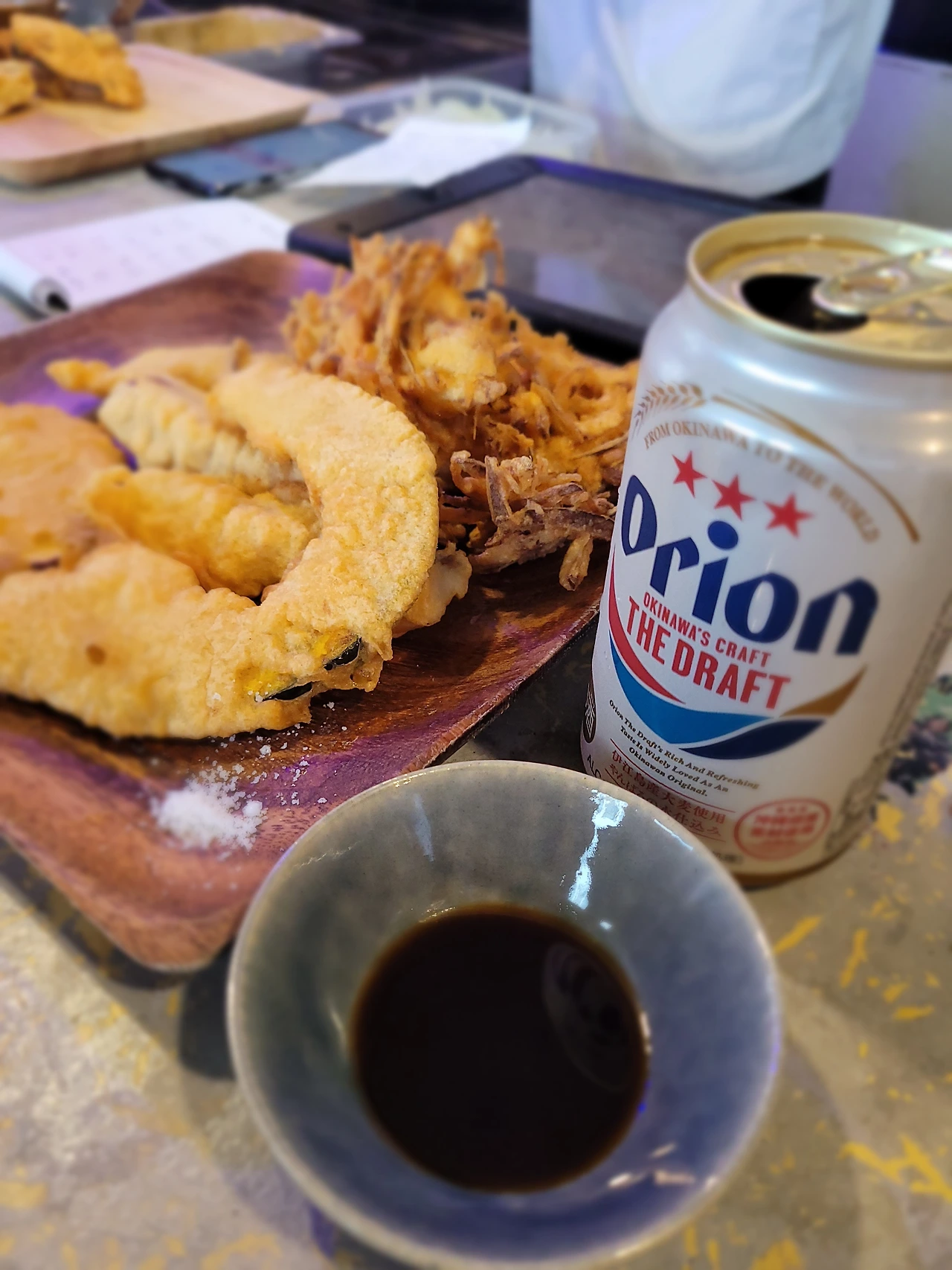 그래도 맛있다. 특히 야채튀김이 맛있어서 추가시켜 더 먹었다. 튀김만 10개 먹었다.나는 오리온맥주 한 캔 추가.
