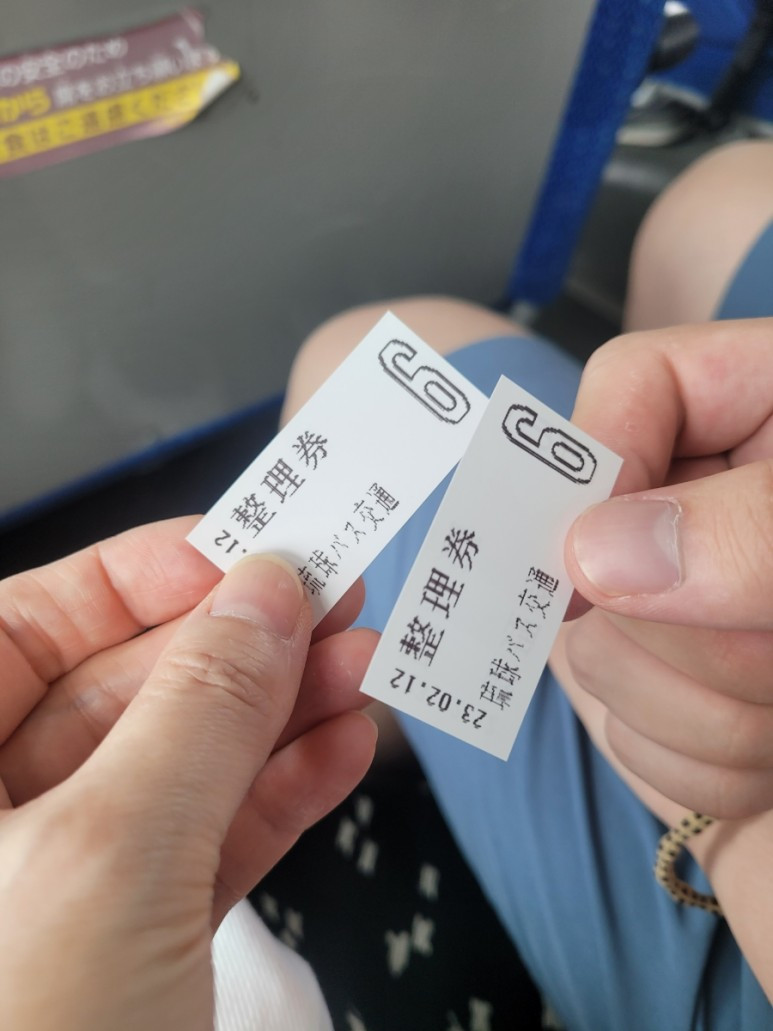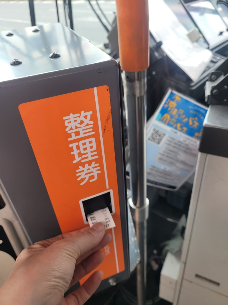 버스 탈 때 입구에서 번호가 적힌 티켓을 뽑으면 거리에 따라 내릴 때 요금이 정해지고 내리면서 그 티켓과 요금을 내면 된다. 우리는 1인당 편도 280엔씩 냈다.