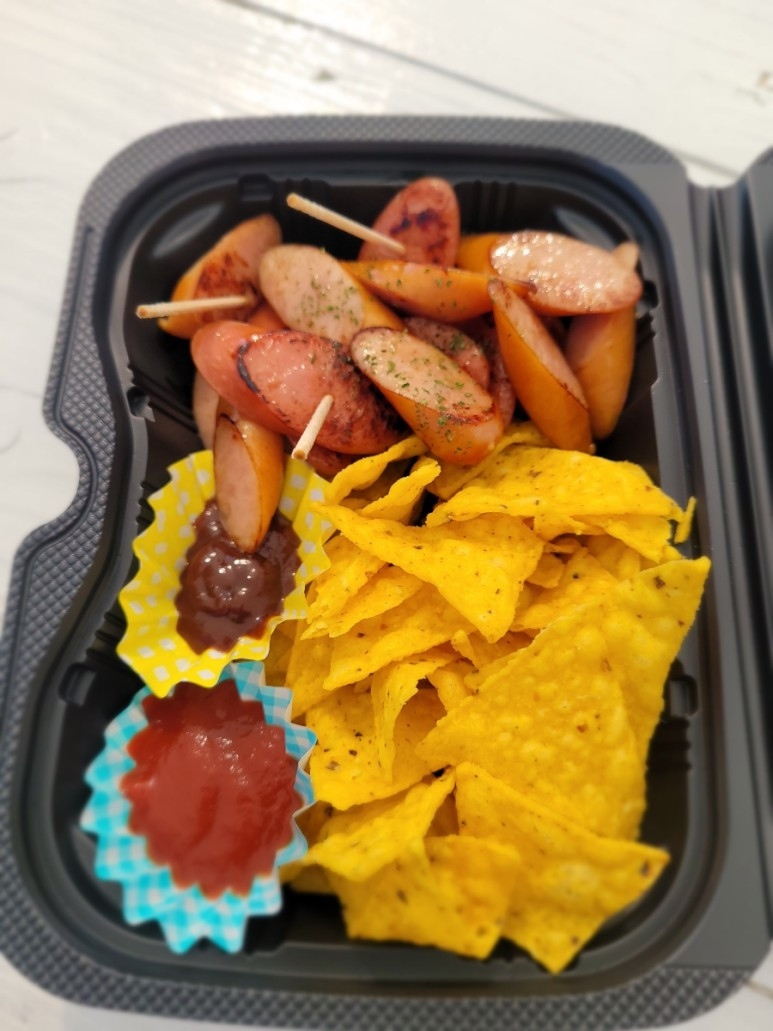우리는 전망 좋은 그늘에 자리 잡고 음료와 소시시 믹스박스를 주문했다.
