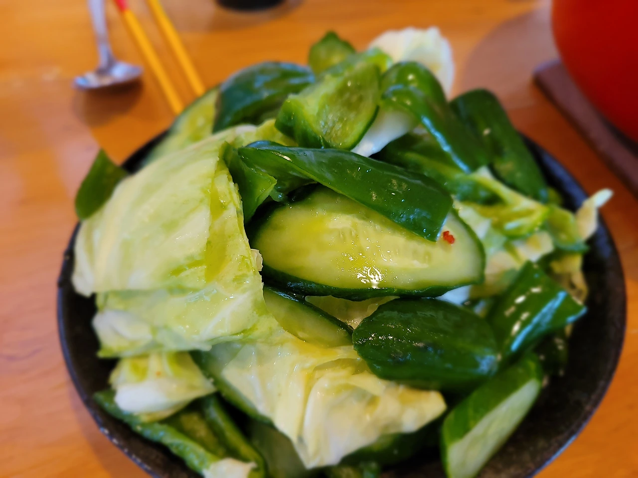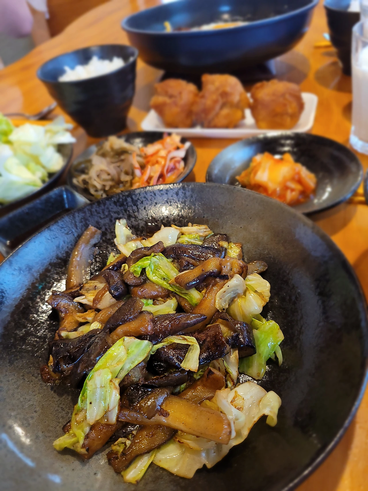 아침에 사 온 가지 두 개에 양배추를 넣어 집에 있는 양념들로 볶아줬는데 너무 맛있다.