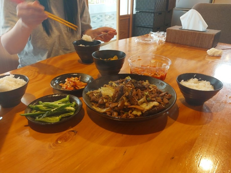 집 앞 슈퍼에서 가지 두 개를 사 와서 어제 남겨둔 돼지고기와 다른 야채들을 섞어 볶음요리를 해 줬다.
