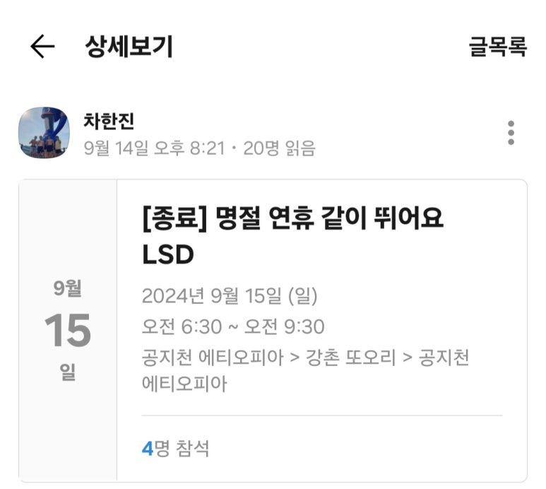 그런데 나이가 조금 먹었다고 막상 혼자 하려고 하니 재미도 없고 외로워서 라이징 포스(크로스핏) 여기도 러닝 단톡방이 있는데 내가 러닝 뛰자고 공지를 띄웠다.
