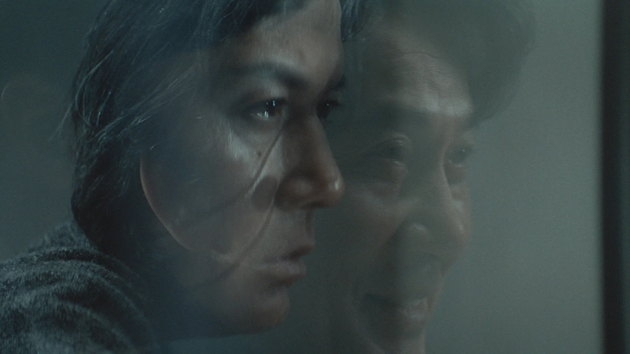 교도소 면회장 유리에 겹치는 두 주인공의 표정.
