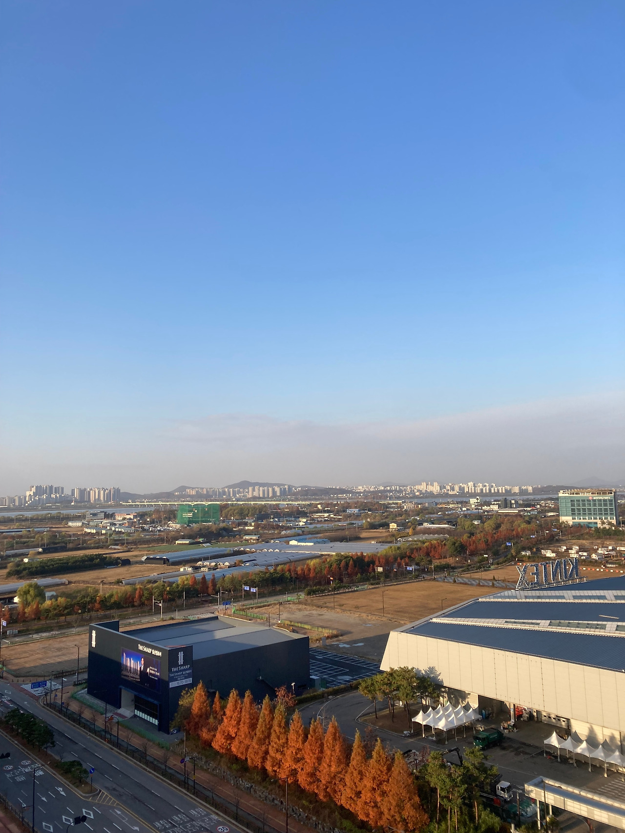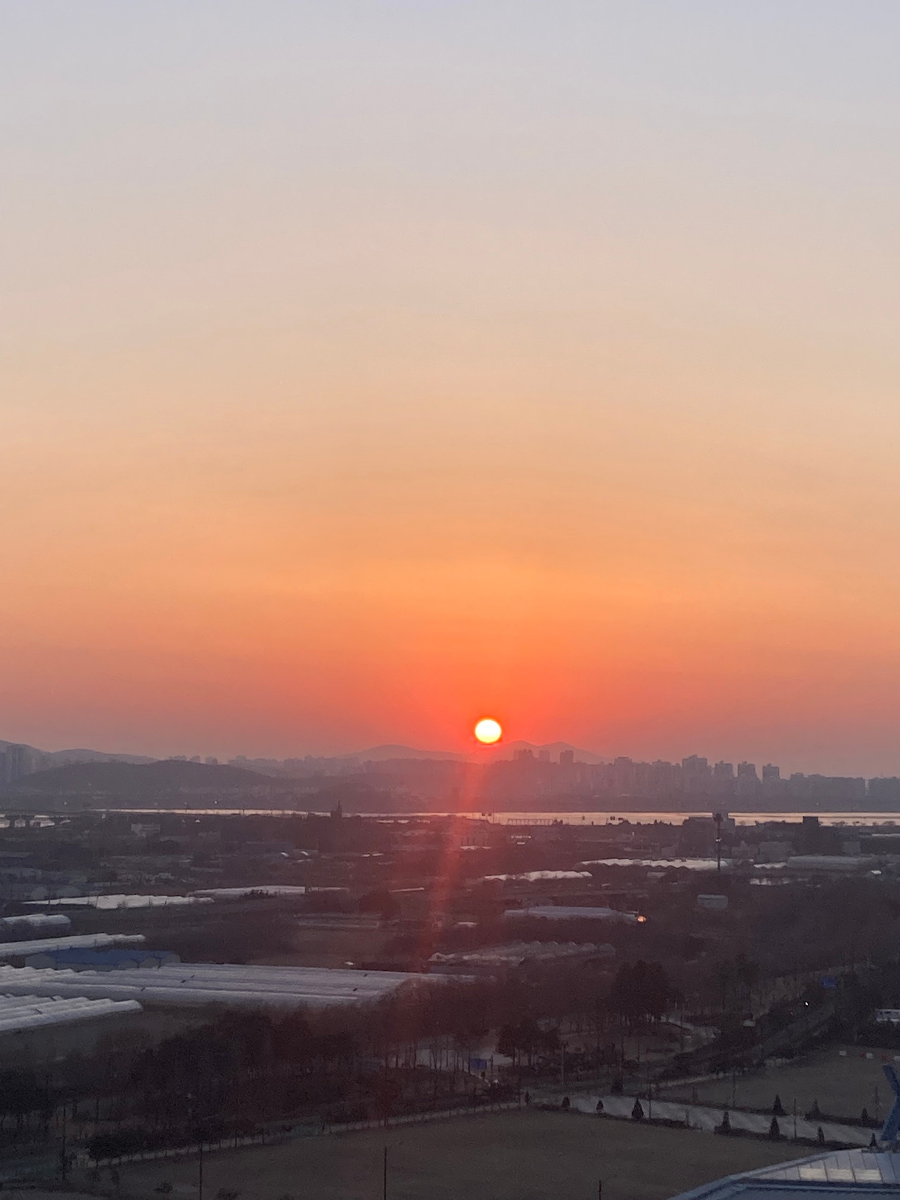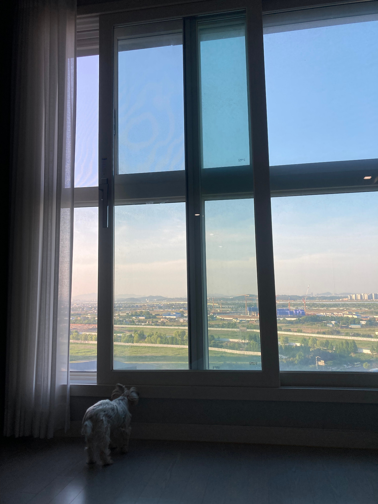 여러 군데 집을 알아보던 중 거실에 들어서자마자 하늘에 떠 있는 듯 탁 트인 뷰가 있는 집을 찾게 되었다. 해가 뜨고 지는 모습을 한눈으로 볼 수 있고 하늘의 색 변화를 그대로 눈으로 담을 수 있는 집이었다. 모든 방에서 바라보는 풍경이 너무나도 멋졌다. 근처에는 큰 호수공원이 있어 매일 아름다운 풍경을 보며 산책도 할 수 있었다.