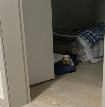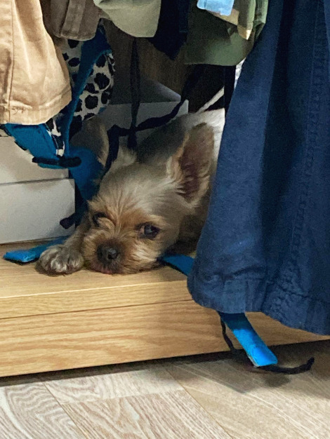 어디선가 요란하게 움직이는 소리가 나더니 뽀삐가 남편의 서재방에서 후다닥 나왔다. 나는 소리가 나는 복도를 쳐다보다가 서재방에서 놀란 눈으로 뛰쳐 나온 뽀삐와 눈이 딱 마주쳤다. 내가 있는 걸 확인하자마자 귀와 꼬리가 축 처진 채 종종걸음으로 나에게 다가왔다. 그러고는 잠깐동안 멈칫하며 내 무릎 위에 재빨리 올라 앉았다.