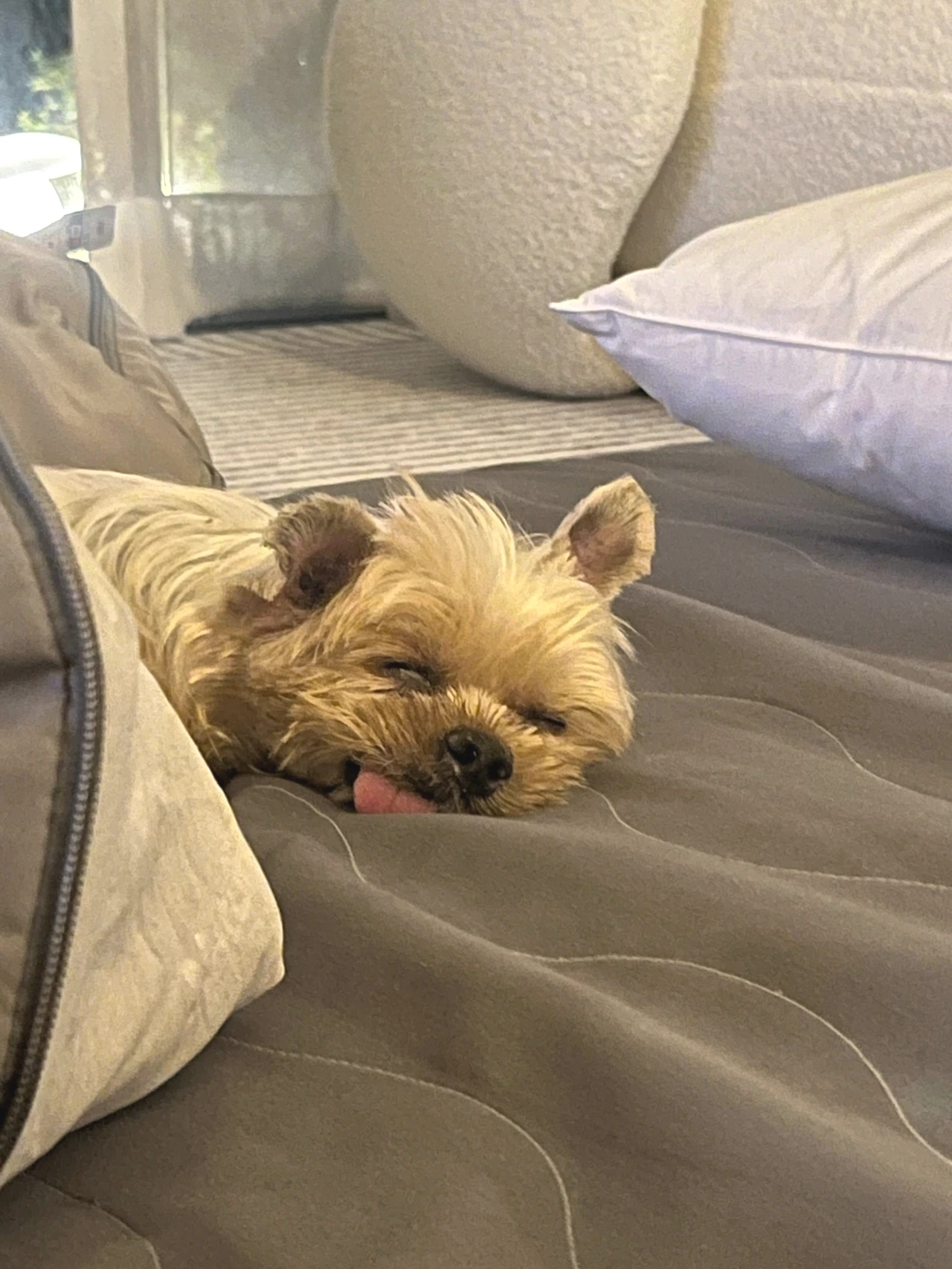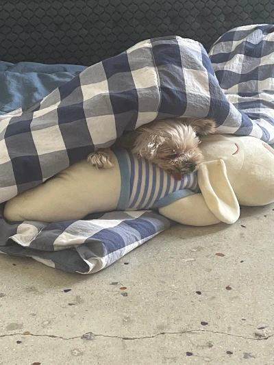 자려고 할 무렵, 뽀삐의 사진이 한 장 도착했다. 맛있게 밥을 먹고 이불속에 쏙 들어가 자는 모습이 귀여웠다. 오늘 밤 잘 때 나를 찾지 않을까 하는 걱정스러운 마음도 있었지만, 그와 함께하는 뽀삐의 평온한 모습에 마음이 놓였다.
