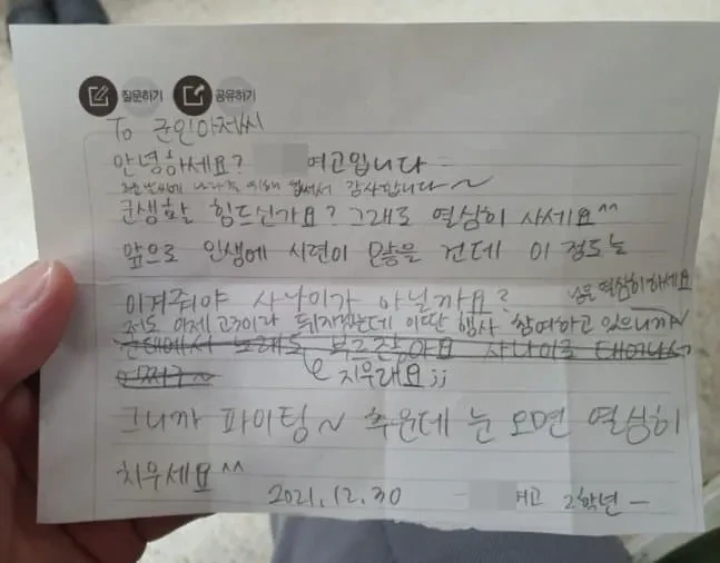 그 수많은 소식들 중에서도 우리 세대 남성이라면 모두가 기억하는 사건이 있다. 바로 군인을 모욕하는 내용으로 가득했던 위문 편지 사건이다. 이는 진명여자고등학교의 위문 편지 행사에 참여한 여고생이 쓴 것으로 알려져 있다. 내용을 직접 읽어보자. 우리 세대의 남성들이 어떻게 반응했을지는 말하지 않아도 알 수 있을 것이다.