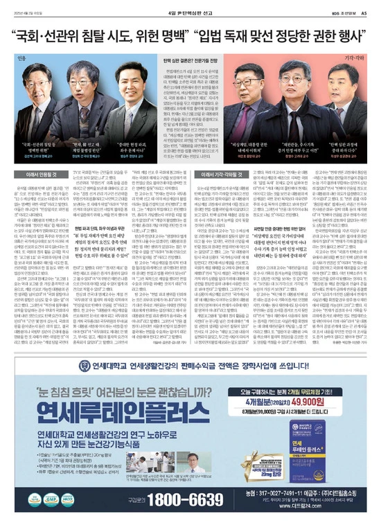이는 2024년 12월 3일의 계엄에 대한 헌법재판소의 판결을 앞두고 나온 기사로, 헌법학자 여섯 명의 의견을 빌려 해당 사건의 위헌성을 다루고 있다. 이 기사에서 가장 눈에 띄는 것은 바로 형식적인 대칭성이다. 중앙의 선을 기준으로 왼쪽에는 파란 배경에 탄핵 위헌론 헌법학자 셋, 오른쪽에는 빨간 배경에 탄핵 합헌론 헌법학자 셋. 그 아래로는 데칼코마니처럼 완전히 포개어질 만큼 계산적으로 구성된 레이아웃. 솜씨를 최대한 발휘하여 중립성을 확보하고자 노력한 것이다. 아마 우리가 흔히 생각했던 가장 중립적인 기사의 모습일지도 모른다.