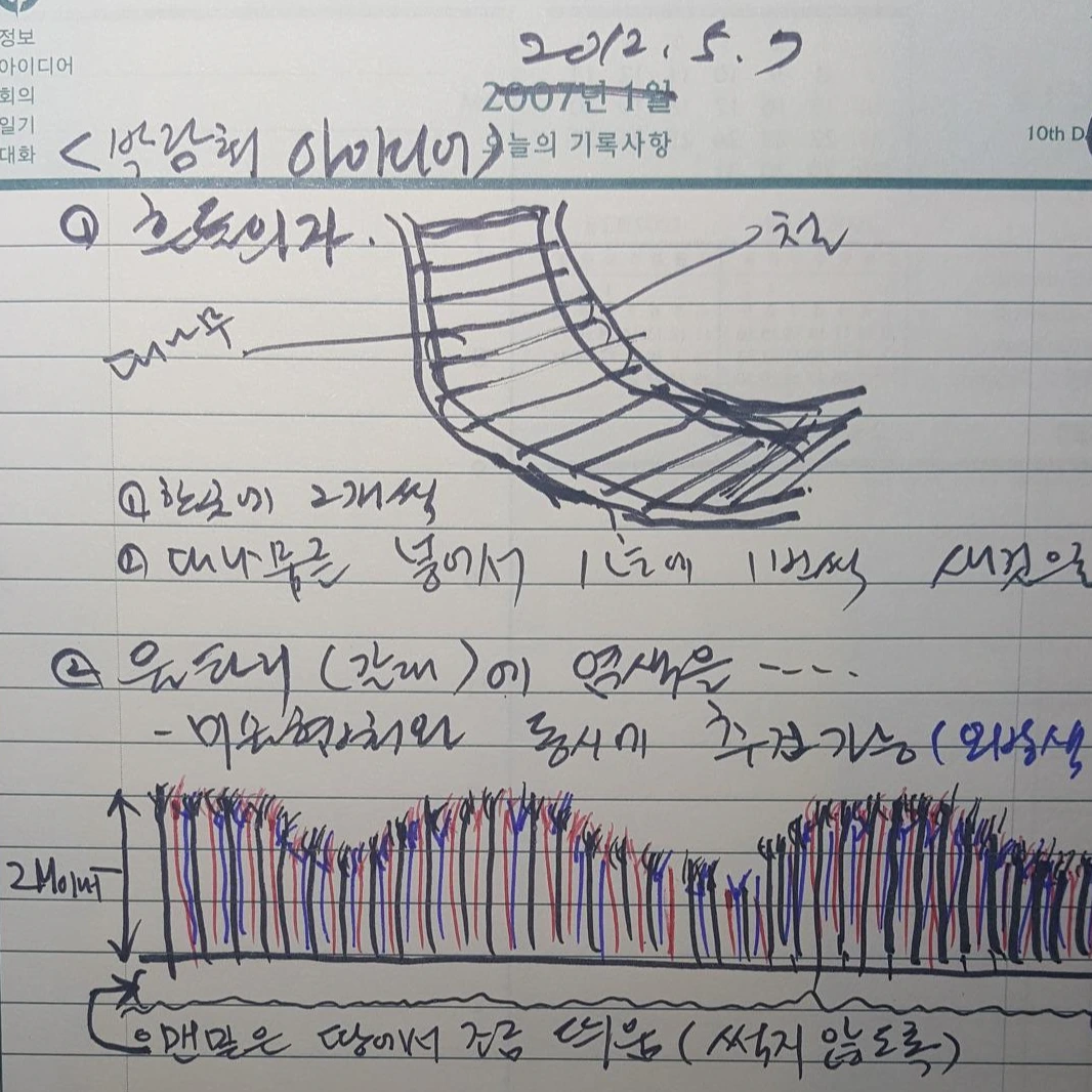 언젠가 일본을 정원 시찰을 하면서 보았던 갈대 울타리가 연상되었다. 연결해서 유럽을 시찰할 때 갈대를 보물 다루듯 다듬는 사람들을 보았다. 바로 이거다. 우리는 한때 갈대가 귀찮다고 불을 질렀는데... 이것을 이용하자. 잠자다 말고 일어나 노트에 갈대울타리를 그렸다, 색깔도 입혀봤다. 파도처럼 웨이브도 주었다. 멋있었다. 다음날 아침 공정회의를 하면서 직원들에게 그림을 보여주면서 이렇게 바꾸면 어떻겠냐고 제안했다. 한 사람도 긍정적인 반응이 없었다. 그렇지 않아도 계획대로 해도 힘든 공정인데, 이제야 바꾸냐? 는 표정이었다. 회의를 마치고 담담 팀장과 별도로 더 깊이 논의했다. 어렵다는 결론이었다. 며칠 후 현장에서 설명했다. 반승낙을 얻었다.