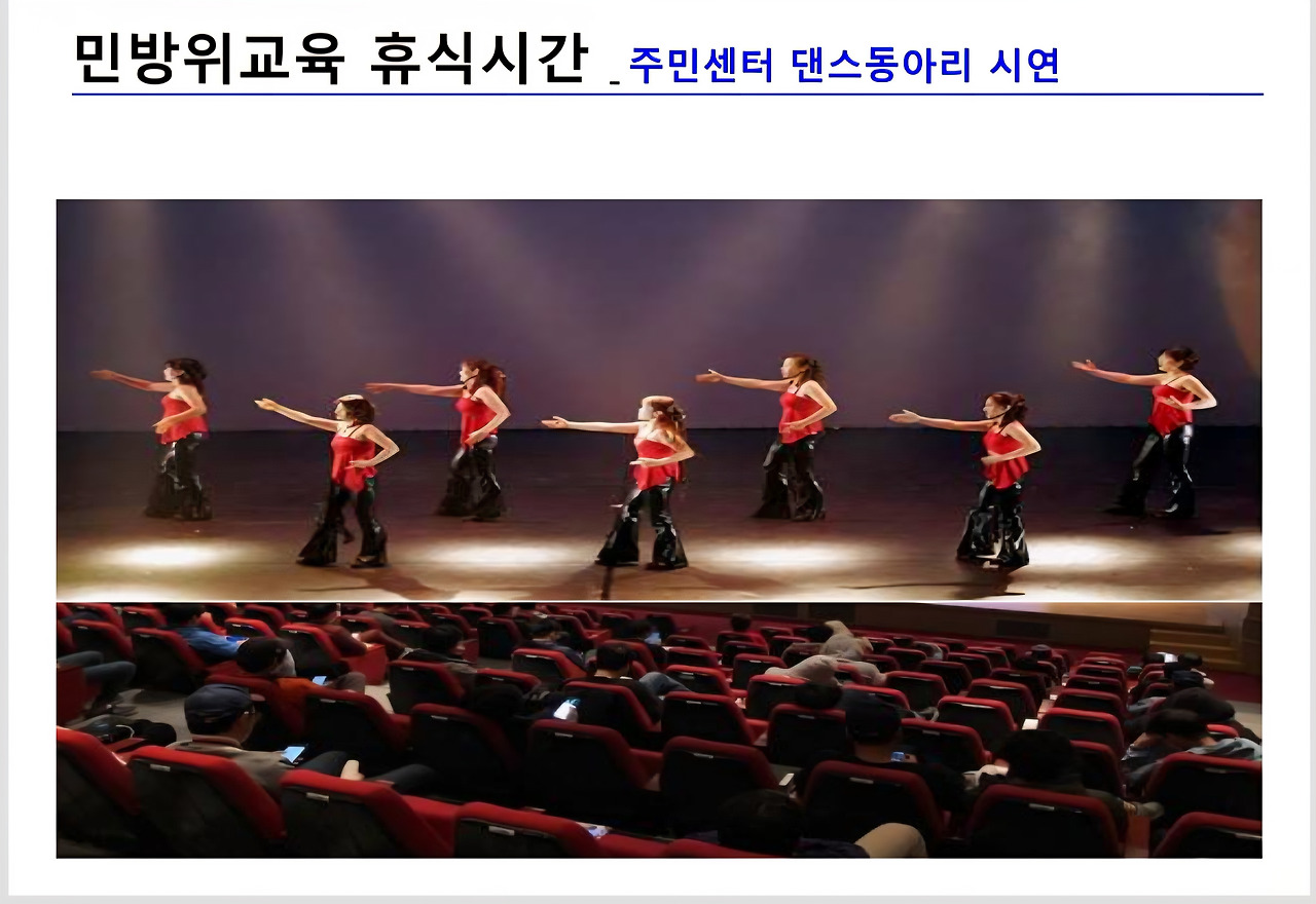 또 다른 문제가 발생했습니다. 쉬는 시간마다 도망가는 대원들이 있었습니다. 이를 위해서는 또 다른 묘책을 냈습니다. 무대를 지역 어머니들의 '스포츠댄스' 팀 경연장으로 내어준 것입니다. 아들뻘 되는 대원들 앞에서 열정적으로 춤을 추는 어머니들의 모습에, 대원들은 화장실도 가지 않고 박수를 치며 몰입했습니다. 민방위 교육장이 순식간에 축제의 장으로 변했습니다.