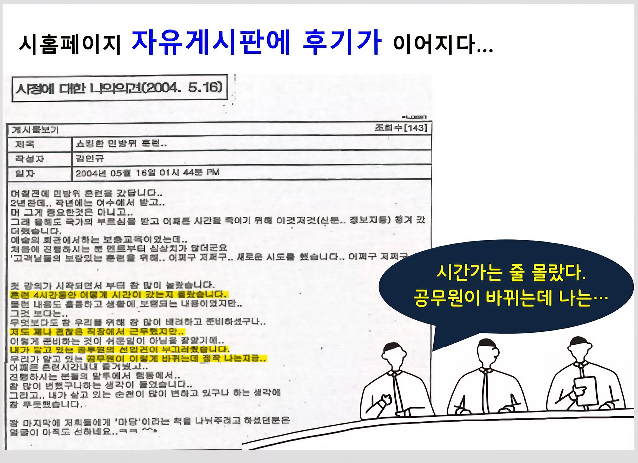 시청 자유게시판은 원래 민원과 비난의 장입니다. 그런데 교육이 끝나면 긍정의 글들이 쏟아졌습니다.