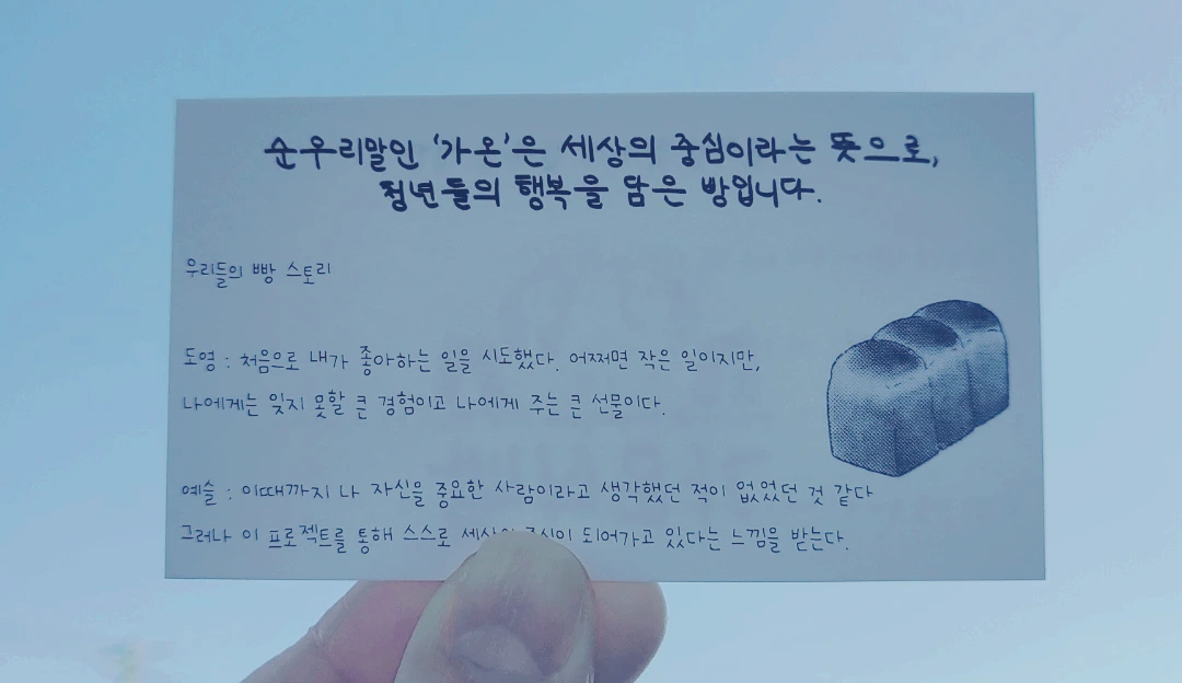 2022년 10월 21일, 의성군 안계면 퀸마트 앞에서 프리마켓이 열렸다. 소비자가 아닌 판매자로 참여해 내 부스에서 내 제품을 팔았다. 우리가 만들어 판매한 빵 이름은 '가온식빵'이다. '가온'이란 세상의 중심이라는 순우리말로 의성지역의 가치와 온기를 담다는 의미도 내포되어 있다. 글을 쓰는 지금도 내가 이런 경험을 했다는 사실이 믿겨지지 않는다. 제빵과는 거리가 먼 전라도 처녀와 경상도 처녀가 이 시골에서 만나 식빵을 만들었다는 사실이 믿겨지지 않는다.