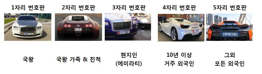 아랍에미레이트의 차번호판이 1번은 '왕', 한자리 숫자는 후계자등 '로열패밀리', 두 자리 수자는 '왕족', 세 자릿수는 '왕족의 친척'. 네 자릿수는 '현지인', 다섯 자릿수는 '외국인'으로 구분되고 있다. 택시는 네 자릿수와 다섯 자릿수 혼용이다.