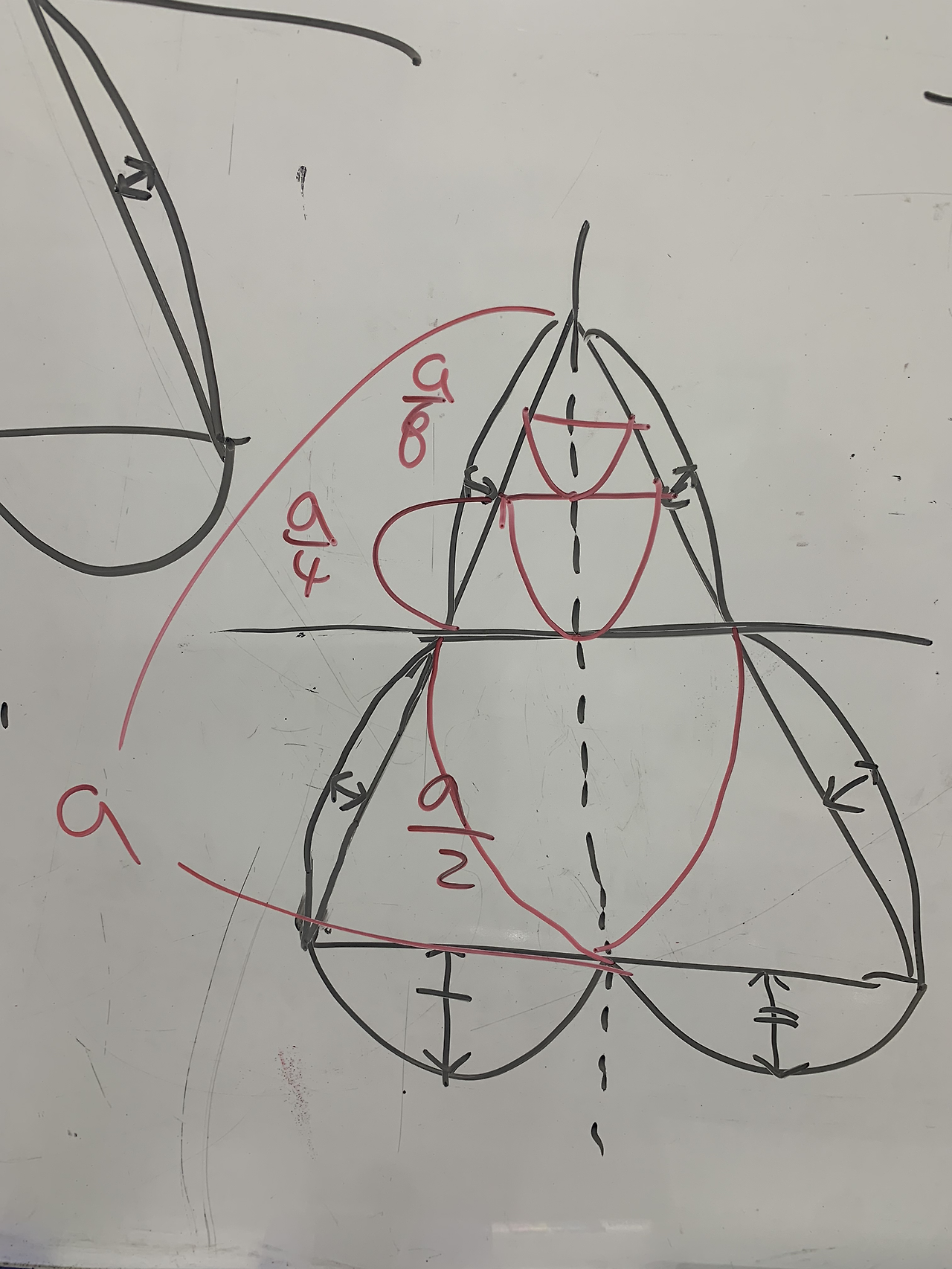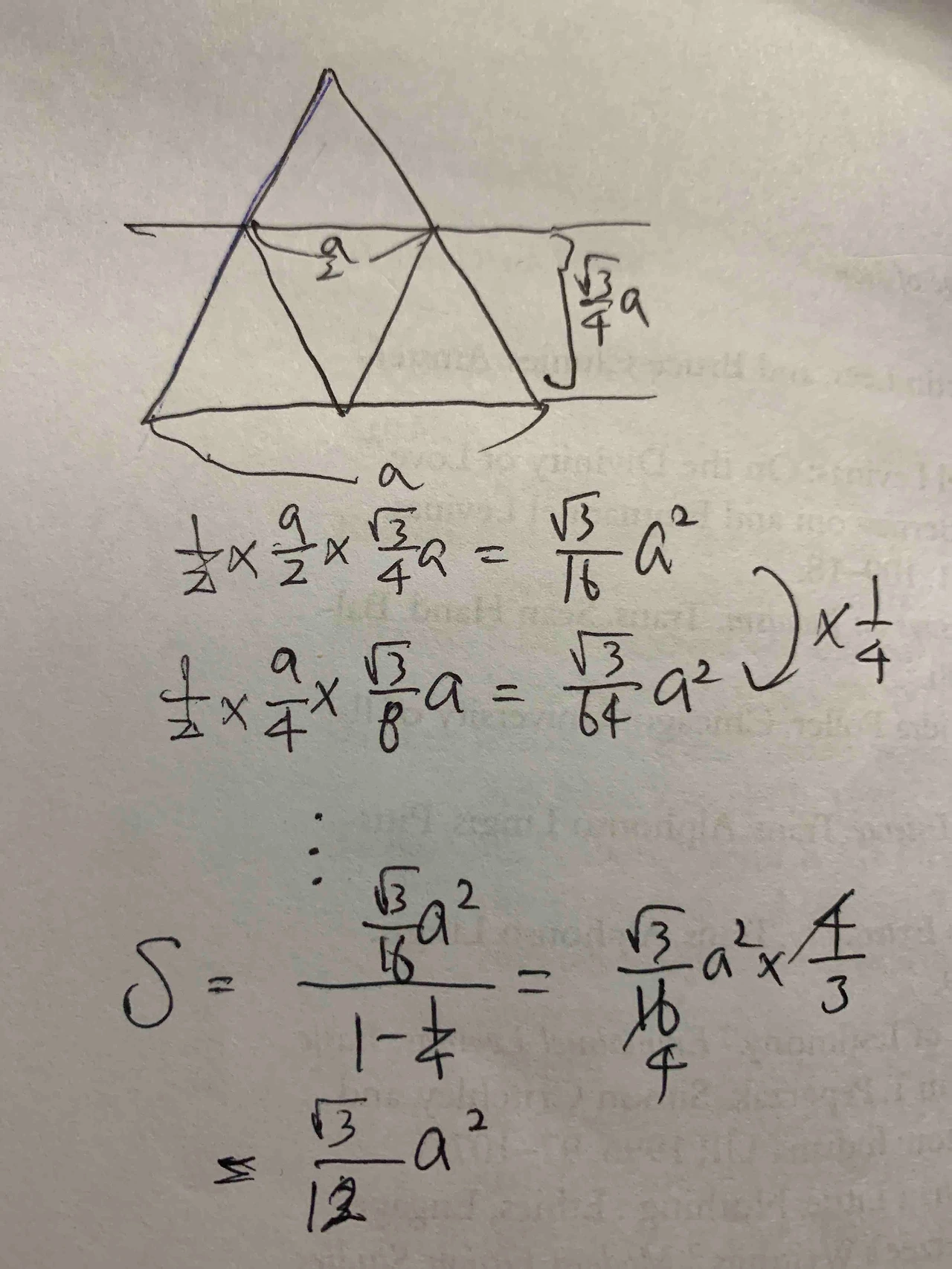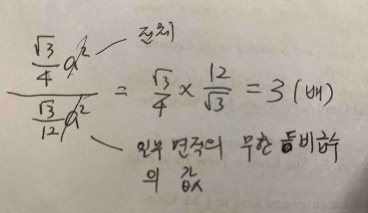 방금 구한 작은 정삼각형의 합은 무한등비급수로 보고 푼 값인데, 그 결과가 정확히 맨 처음 나온 맨 바깥의 큰 정삼각형의 1/3배가 되지요.
