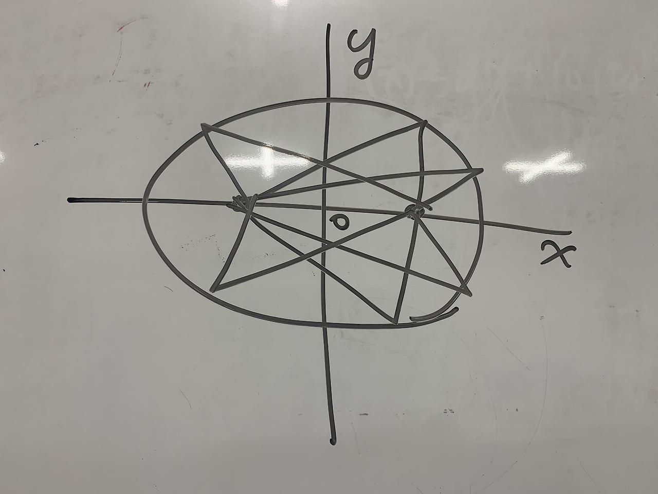 고등학교때 배웠던 바에 의하면 초점을 기준으로 타원 위의 점이 일정한 값을 유지합니다. 실제로 초점에 못을 벅로 일정한 길이의 실을 묶고 실 아래에 연필을 놓아 실을 따라가며 그림을 그리면 위와 같은 타원형이 나옵니다.