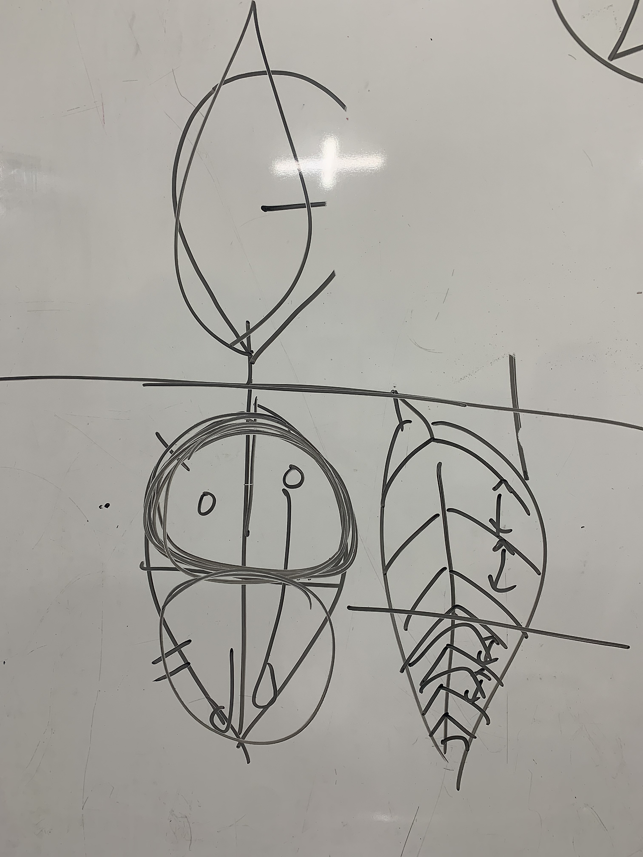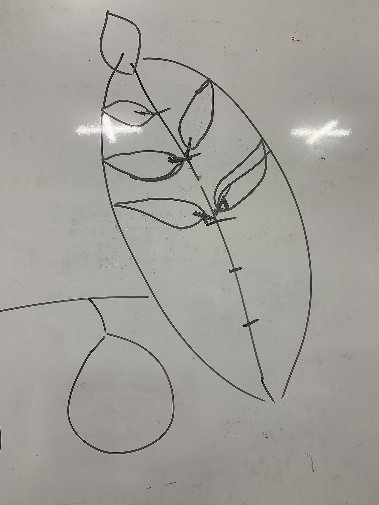 그리고 전체 잎 한장을 보더라도 변형된 타원형의 모습입니다. 이 잎들이 특정각도로 줄기에 붙어서 기울기를 형성하고 광합성작용을 해서 나무를 먹여 살립니다. 같은 식구를 먹여살리는 잎은 한쪽이 뾰족한 타원형을 활용해 바람에 움직임에 더 잘 반응할 수 있고 이슬리 맺혔을 때 더 잘 털어낼 수 있고, 곤충이 잎 위에 않을 때도 안정감(삼각형을 이용해 앉는 곤충의 특성에 도움을 주은 구조로 잎의 아래부문은 역삼각형으로 되어 있고 곤충은 삼각보법으로 잎에서 균형을 잡으면서 휴식을 취하거나 먹이활동을 할 수 있음)을 줄 수도 있지요.
